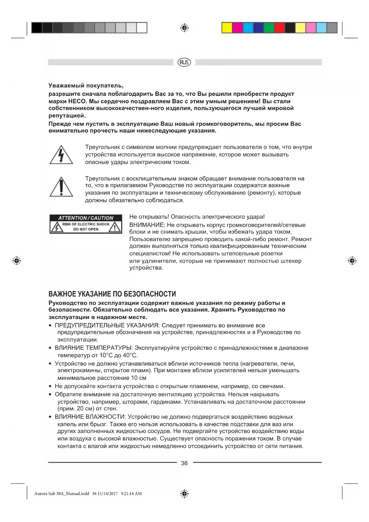 - ВЛИЯНИЕ ВЛАЖНОСТИ: Устройство не должно подвергаться воздействию водяных капель или брызг. Также его нельзя использовать в качестве подставки для ваз или других заполненных жидкостью сосудов. Не подвергайте устройство воздействию воды или воздуха с высокой влажностью. Существует опасность поражения током. В случае контакта с влагой или жидкостью немедленно отсоединить устройство от сети питания. Aurora Sub 30A_Manual.indd 36 11/14/2017 9:21:14 AM37
