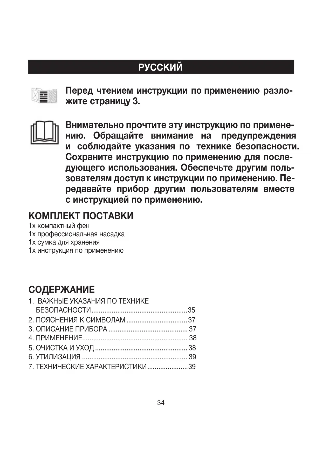 КОМПЛЕКТ ПОСТАВКИ 1xкомпактный фен 1xпрофессиональная насадка 1xсумка для хранения 1xинструкция поприменению34 35