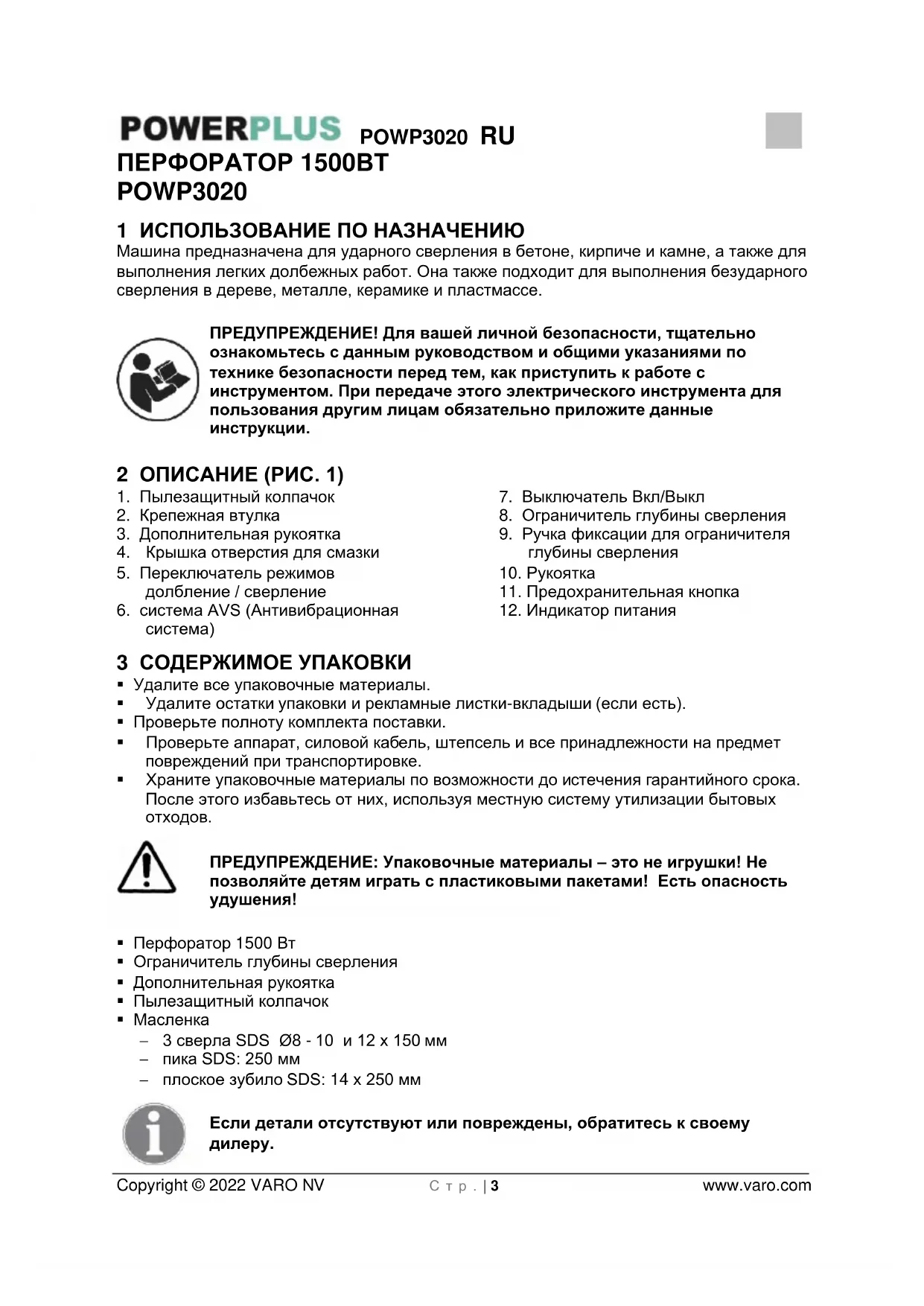 - POWP3020 RU Copyright © 2022 VARO NV С т р . | 2 www.varo.com 16 ДЕКЛАРАЦИЯ О СООТВЕТСТВИИ POWP3020 RU Copyright © 2022 VARO NV С т р . | 3 www.varo.com ПЕРФОРАТОР 1500ВТ POWP3020 1 ИСПОЛЬЗОВАНИЕ ПО НАЗНАЧЕНИЮ Машина предназначена для ударного сверления в бетоне, кирпиче и камне, а также для выполнения легких долбежных работ. Она также подходит для выполнения безударного сверления в дереве, металле, керамике и пластмассе. ПРЕДУПРЕЖДЕНИЕ! Для вашей личной безопасности, тщательно ознакомьтесь с данным руководством и общими указаниями по технике безопасности перед тем, как приступить к работе с инструментом. При передаче этого электрического инструмента для пользования другим лицам обязательно приложите данные инструкции. 2 ОПИСАНИЕ (РИС. 1) p. 11