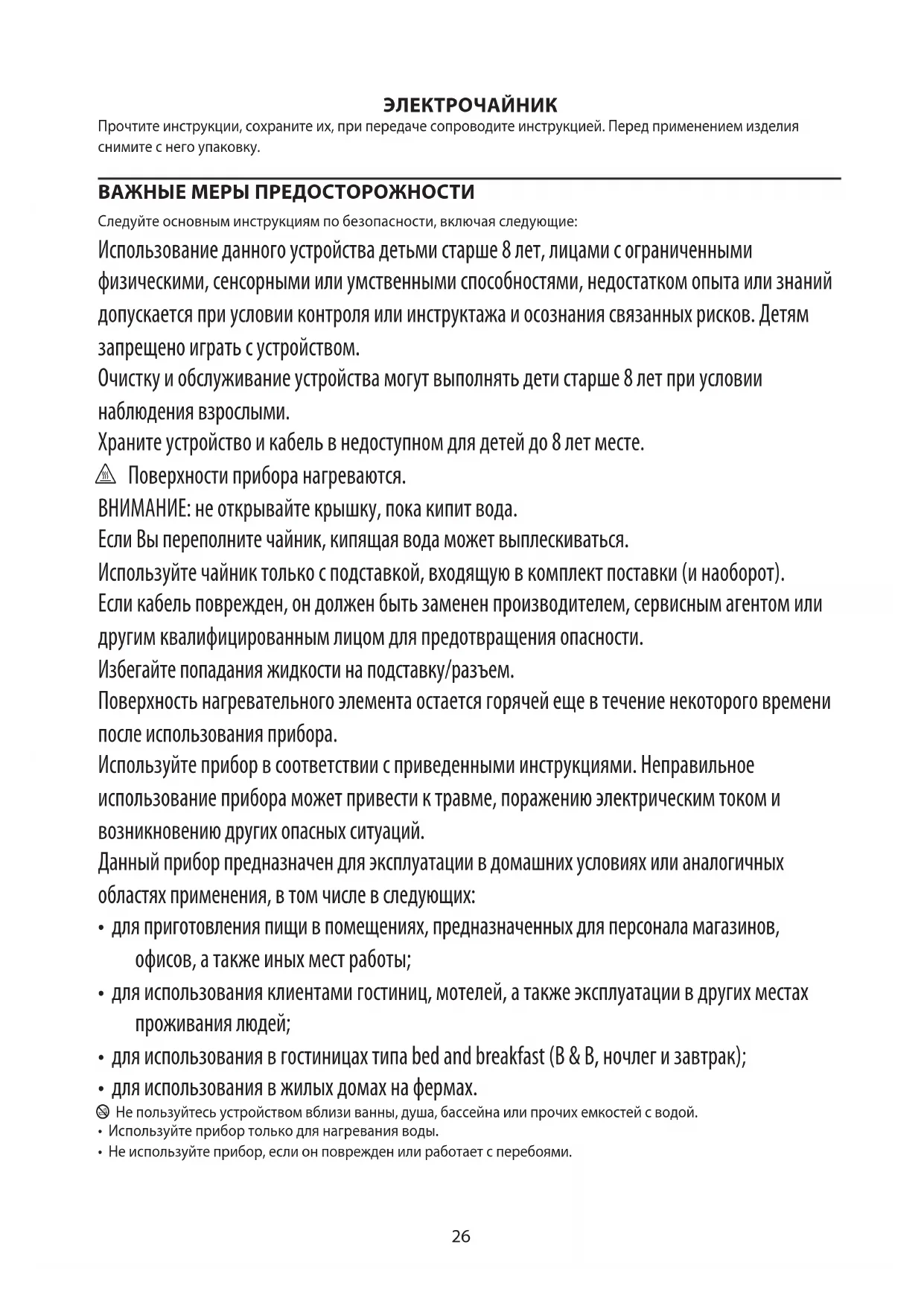 AE26 ЭЛЕКТРОЧАЙНИК Прочтите инструкции, сохраните их, при передаче сопроводите инструкцией. Перед применением изделия снимите с него упаковку. ВАЖНЫЕ МЕРЫ ПРЕДОСТОРОЖНОСТИ Следуйте основным инструкциям по безопасности, включая следующие: Использование данного устройства детьми старше 8 лет, лицами с ограниченными физическими, сенсорными или умственными способностями, недостатком опыта или знаний допускается при условии контроля или инструктажа и осознания связанных рисков. Детям запрещено играть с устройством. Очистку и обслуживание устройства могут выполнять дети старше 8 лет при условии наблюдения взрослыми. Храните устройство и кабель в недоступном для детей до 8 лет месте. h Поверхности прибора нагреваются. ВНИМАНИЕ: не открывайте крышку, пока кипит вода. Если Вы переполните чайник, кипящая вода может выплескиваться. Используйте чайник только с подставкой, входящую в комплект поставки (и наоборот). Если кабель поврежден, он должен быть заменен производителем, сервисным агентом или другим квалифицированным лицом для предотвращения опасности. Избегайте попадания жидкости на подставку/разъем. Поверхность нагревательного элемента остается горячей еще в течение некоторого времени после использования прибора. Используйте прибор в соответствии с приведенными инструкциями. Неправильное использование прибора может привести к травме, поражению электрическим током и возникновению других опасных ситуаций. Данный прибор предназначен для эксплуатации в домашних условиях или аналогичных областях применения, в том числе в следующих: