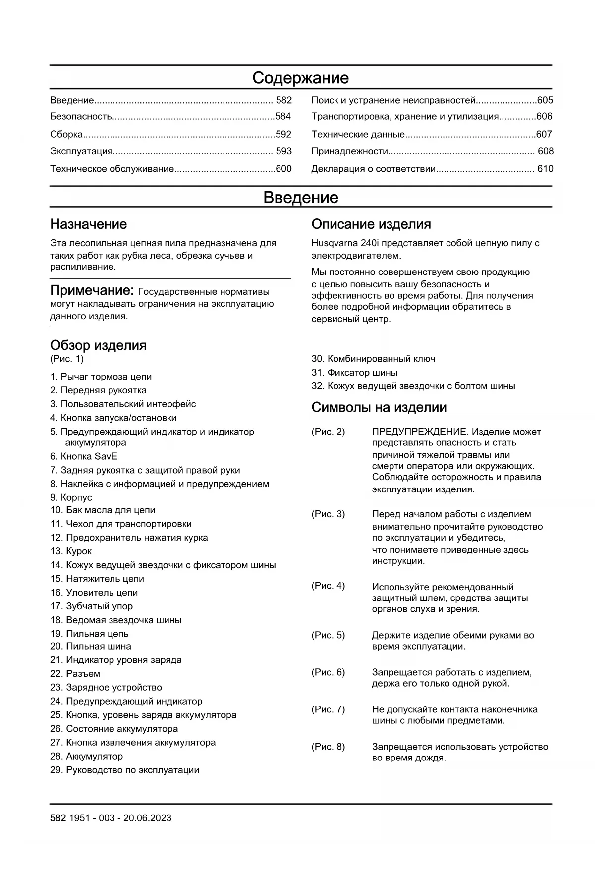Символы на изделии (Pис. 2) ПРЕДУПРЕЖДЕНИЕ. Изделие может представлять опасность и стать причиной тяжелой травмы или смерти оператора или окружающих. Соблюдайте осторожность и правила эксплуатации изделия. (Pис. 3) Перед началом работы с изделием внимательно прочитайте руководство по эксплуатации и убедитесь, что понимаете приведенные здесь инструкции. (Pис. 4) Используйте рекомендованный защитный шлем, средства защиты органов слуха и зрения. (Pис. 5) Держите изделие обеими руками во время эксплуатации. (Pис. 6) Запрещается работать с изделием, держа его только одной рукой. (Pис. 7) Не допускайте контакта наконечника шины с любыми предметами. (Pис. 8) Запрещается использовать устройство во время дождя. 582 1951 - 003 - 20.06.2023(Pис. 9) Предупреждение! При контакте носовой части шины с каким-либо предметом возможна отдача. При этом шину отбрасывает в направлении оператора. Опасность тяжелой травмы или смерти. (Pис. 10) Номинальное напряжение, В (Pис. 11) Масло для смазки цепи. (Pис. 12) Направление вращения цепи и максимальная длина шины. (Pис. 13) Постоянный ток. (Pис. 21) Тормоз цепи, включен (вперед). Тормоз цепи, выключен (назад). (Pис. 22) Направление движения