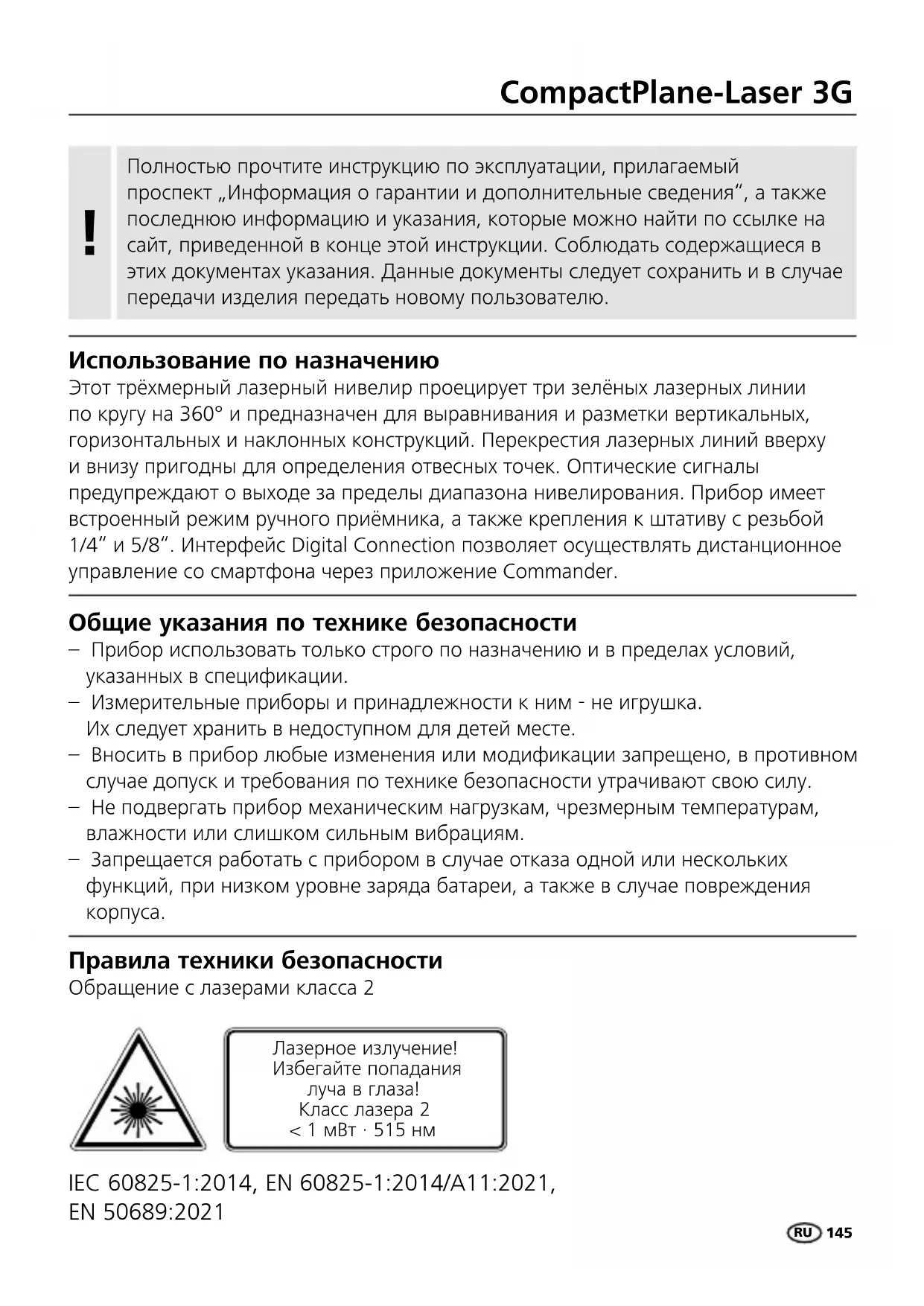 Правила техники безопасности Обращение с электромагнитным излучением Правила техники безопасности Обращение с радиочастотным излучением – В измерительном приборе соблюдены нормы и предельные значения, установленные применительно к электромагнитной совместимости согласно директиве об ЭМС, которая дублируется директивой о радиооборудовании 2014/53/EU. – Следует соблюдать действующие в конкретных местах ограничения по эксплуатации, например, запрет на использование в больницах, в самолетах, на автозаправках или рядом с людьми с кардиостимуляторами. В таких условиях существует возможность опасного воздействия или возникновения помех от и для электронных приборов. – Эксплуатация под высоким напряжением или в условиях действия мощных электромагнитных переменных полей может повлиять на точность измерений. – Измерительный прибор снабжен радиоинтерфейсом. – В измерительном приборе соблюдены нормы и предельные значения, установленные применительно к электромагнитной совместимости и радиоизлучению согласно директиве о радиооборудовании 2014/53/EU. – Настоящим Umarex GmbH & Co. KG заявляет, что радиооборудование типа CompactPlane-Laser 3G выполняет существенные требования и соответствует остальным положениям европейской директивы о радиооборудовании 2014/53/EU (RED). Полный текст Заявления о соответствии нормам ЕС можно скачать через Интернет по следующему адресу: https://packd.li/ll/anb/in – Внимание: Запрещается направлять прямой или отраженный луч в глаза. – Запрещается направлять лазерный луч на людей. – Если лазерное излучение класса 2 попадает в глаза, необходимо закрыть глаза и немедленно убрать голову из зоны луча. – Ни в коем случае не смотреть в лазерный луч при помощи оптических приборов (лупы, микроскопа, бинокля, ...). – Не использовать лазер на уровне глаз (1,40 - 1,90 м). – Во время работы лазерных устройств закрывать хорошо отражающие, зеркальные или глянцевые поверхности. – В местах общего пользования по возможности ограничивать ход лучей с помощью ограждений и перегородок и размещать предупреждающие таблички в зоне действия лазерного излучения. RUCompactPlane-Laser 3G