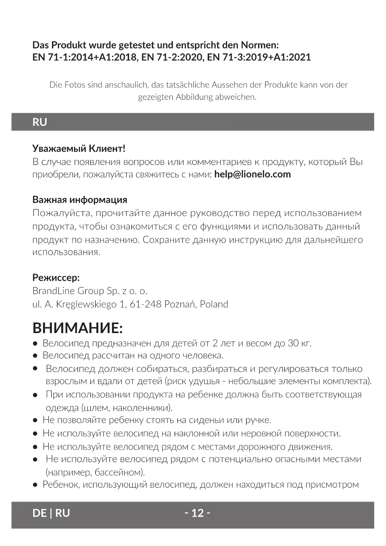 DE | RU Уважаемый Клиент! В случае появления вопросов или комментариев к продукту, который Вы приобрели, пожалуйста свяжитесь с нами: help@lionelo.com Важная информация Пожалуйста, прочитайте данное руководство перед использованием продукта, чтобы ознакомиться с его функциями и использовать данный продукт по назначению. Сохраните данную инструкцию для дальнейшего использования.