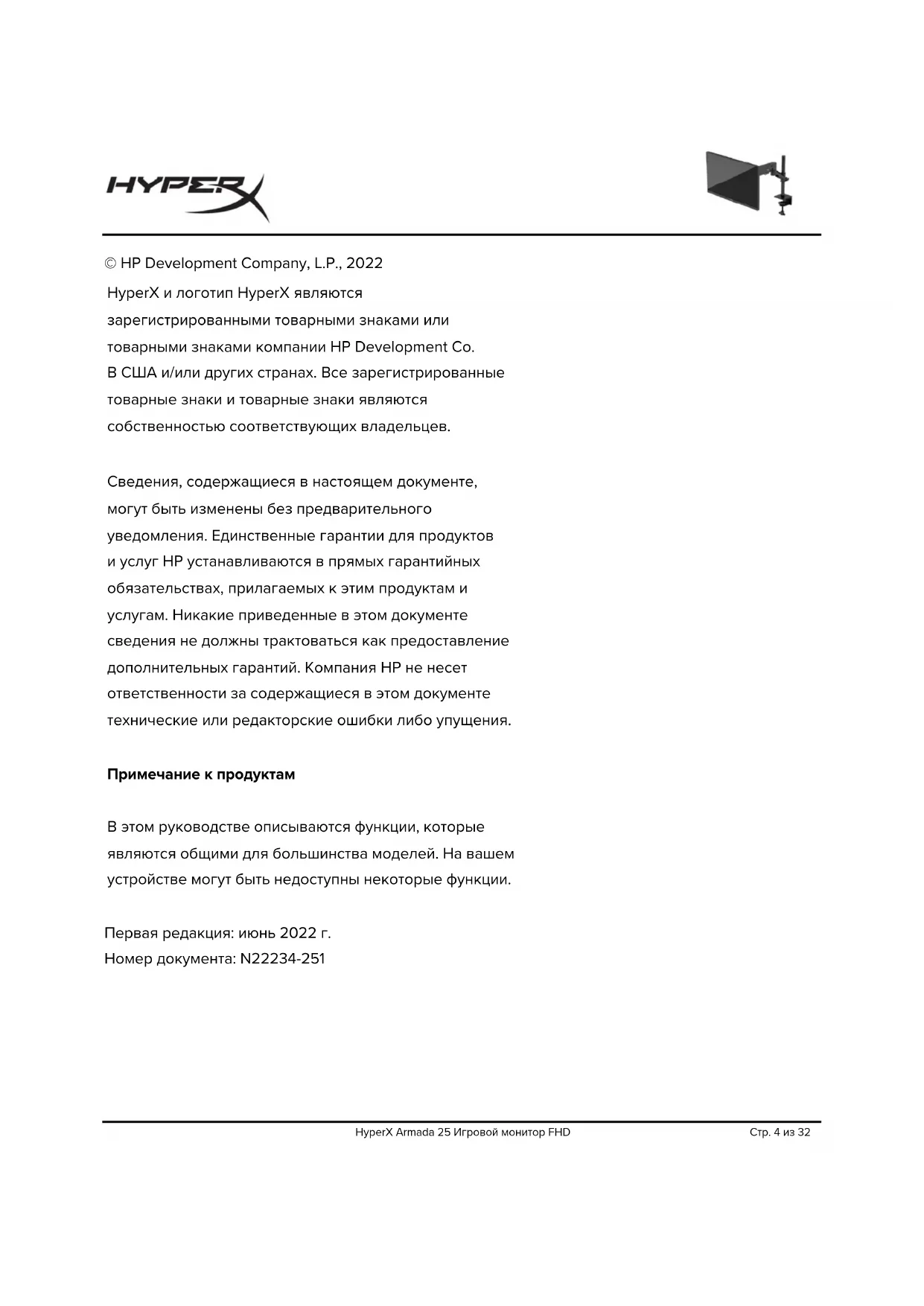 © HP Development Company, L.P., 2022 HyperX и логотип HyperX являются зарегистрированными товарными знаками или товарными знаками компании HP Development Co. В США и/или других странах. Все зарегистрированные товарные знаки и товарные знаки являются собственностью соответствующих владельцев. Сведения, содержащиеся в настоящем документе, могут быть изменены без предварительного уведомления. Единственные гарантии для продуктов и услуг HP устанавливаются в прямых гарантийных обязательствах, прилагаемых к этим продуктам и услугам. Никакие приведенные в этом документе сведения не должны трактоваться как предоставление дополнительных гарантий. Компания HP не несет ответственности за содержащиеся в этом документе технические или редакторские ошибки либо упущения. Примечание к продуктам В этом руководстве описываются функции, которые являются общими для большинства моделей. На вашем устройстве могут быть недоступны некоторые функции. Первая редакция: июнь 2022 г. Номер документа: N22234-251HyperX Armada 25 Игровой монитор FHD Стр. 5 из 32