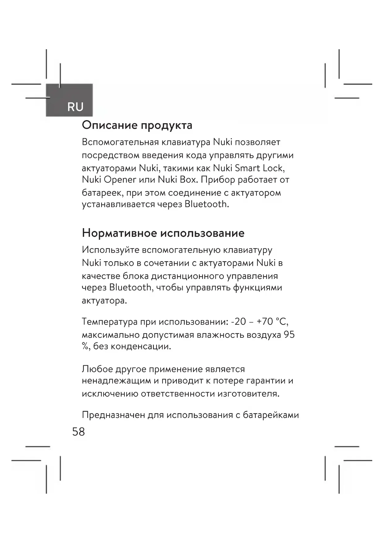 Описание продукта Вспомогательная клавиатура Nuki позволяет посредством введения кода управлять другими актуаторами Nuki, такими как Nuki Smart Lock, Nuki Opener или Nuki Box. Прибор работает от батареек, при этом соединение с актуатором устанавливается через Bluetooth. Нормативное использование Используйте вспомогательную клавиатуру Nuki только в сочетании с актуаторами Nuki в качестве блока дистанционного управления через Bluetooth, чтобы управлять функциями