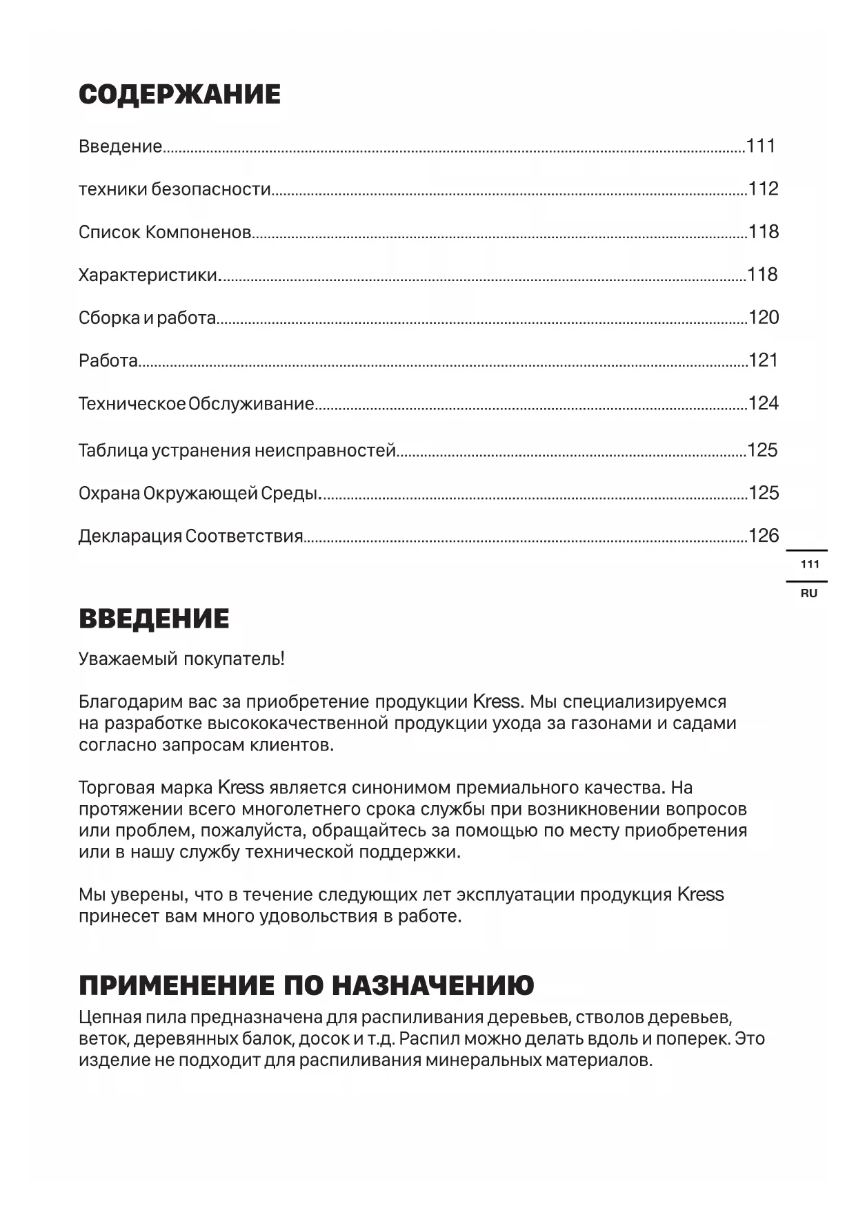 Уважаемый покупатель! Благодарим вас за приобретение продукции Kress. Мы специализируемся на разработке высококачественной продукции ухода за газонами и садами согласно запросам клиентов. Торговая марка Kress является синонимом премиального качества. На протяжении всего многолетнего срока службы при возникновении вопросов или проблем, пожалуйста, обращайтесь за помощью по месту приобретения или в нашу службу технической поддержки. Мы уверены, что в течение следующих лет эксплуатации продукция Kress принесет вам много удовольствия в работе. ПРИМЕНЕНИЕ ПО НАЗНАЧЕНИЮ Цепная пила предназначена для распиливания деревьев, стволов деревьев, веток, деревянных балок, досок и т.д. Распил можно делать вдоль и поперек. Это изделие не подходит для распиливания минеральных материалов.112