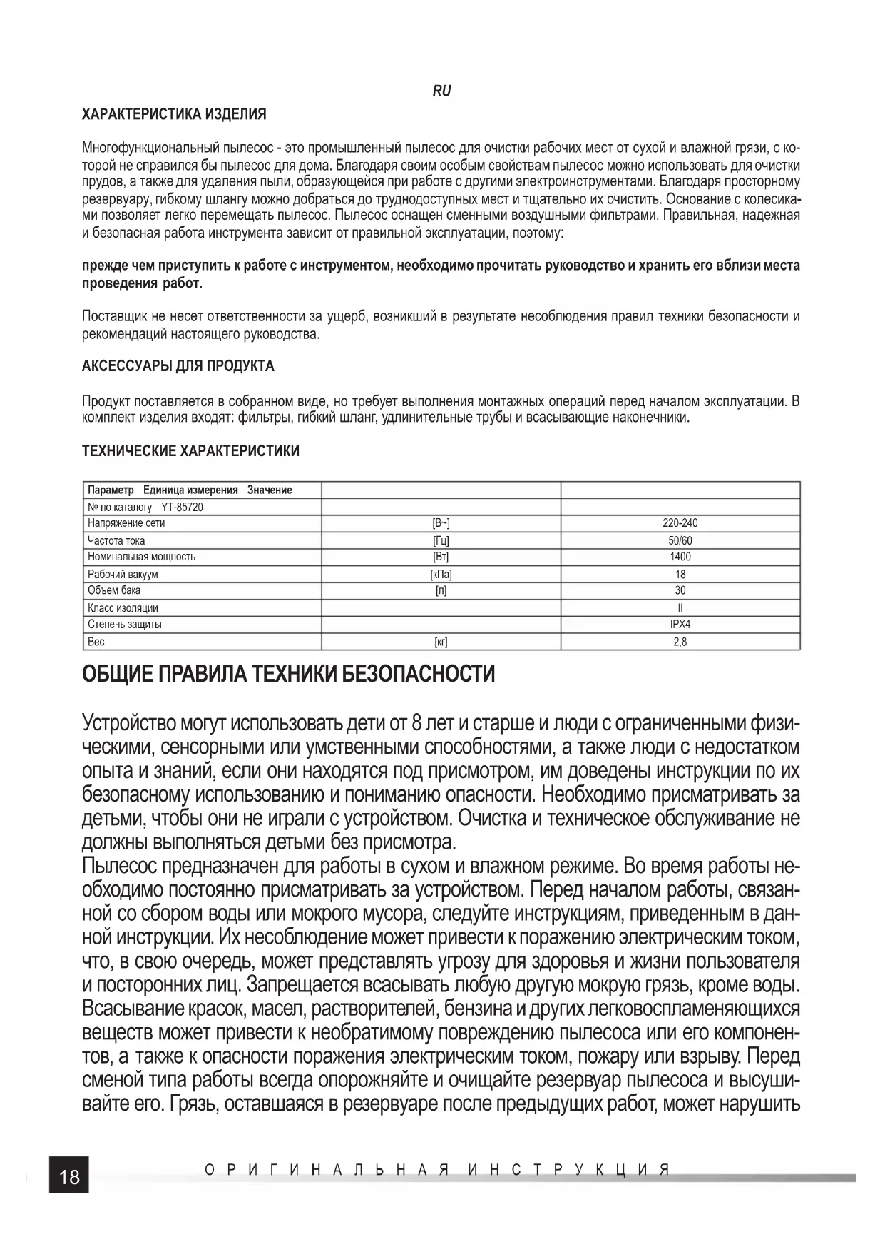 Поставщик не несет ответственности за ущерб, возникший в результате несоблюдения правил техники безопасности и рекомендаций настоящего руководства. АКСЕССУАРЫ ДЛЯ ПРОДУКТА Продукт поставляется в собранном виде, но требует выполнения монтажных операций перед началом эксплуатации. В комплект изделия входят: фильтры, гибкий шланг, удлинительные трубы и всасывающие наконечники. ТЕХНИЧЕСКИЕ ХАРАКТЕРИСТИКИ Параметр Единица измерения Значение № по каталогу YT-85720 Напряжение сети [В~] 220-240 Частота тока [Гц] 50/60 Номинальная мощность [Вт] 1400 Рабочий вакуум [кПа]18 Объем бака [л]30 Класс изоляции II Степень защиты IPX4 Вес [кг] 2,8 ОБЩИЕ ПРАВИЛА ТЕХНИКИ БЕЗОПАСНОСТИ Устройство могут использовать дети от 8 лет и старше и люди с ограниченными физи- ческими, сенсорными или умственными способностями, а также люди с недостатком опыта и знаний, если они находятся под присмотром, им доведены инструкции по их безопасному использованию и пониманию опасности. Необходимо присматривать за детьми, чтобы они не играли с устройством. Очистка и техническое обслуживание не должны выполняться детьми без присмотра. Пылесос предназначен для работы в сухом и влажном режиме. Во время работы не- обходимо постоянно присматривать за устройством. Перед началом работы, связан- ной со сбором воды или мокрого мусора, следуйте инструкциям, приведенным в дан- ной инструкции. Их несоблюдение может привести к поражению электрическим током, что, в свою очередь, может представлять угрозу для здоровья и жизни пользователя и посторонних лиц. Запрещается всасывать любую другую мокрую грязь, кроме воды. Всасывание красок, масел, растворителей, бензина и других легковоспламеняющихся веществ может привести к необратимому повреждению пылесоса или его компонен-