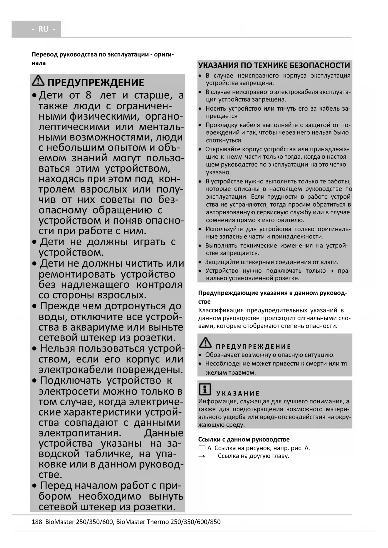 - Несоблюдение может привести к смерти или тя- желым травмам. У К А З А Н И Е Информация, служащая для лучшего понимания, а также для предотвращения возможного матери- ального ущерба или вредного воздействия на окру- жающую среду. Ссылки с данном руководстве A Ссылка на рисунок, напр. рис. A.