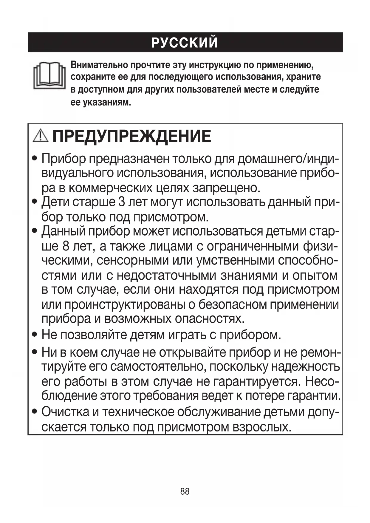 Данный прибор может использоваться детьми стар- ше 8лет, атакже лицами сограниченными физи- ческими, сенсорными или умственными способно- стями или снедостаточными знаниями иопытом втом случае, если они находятся под присмотром или проинструктированы обезопасном применении прибора ивозможных опасностях.