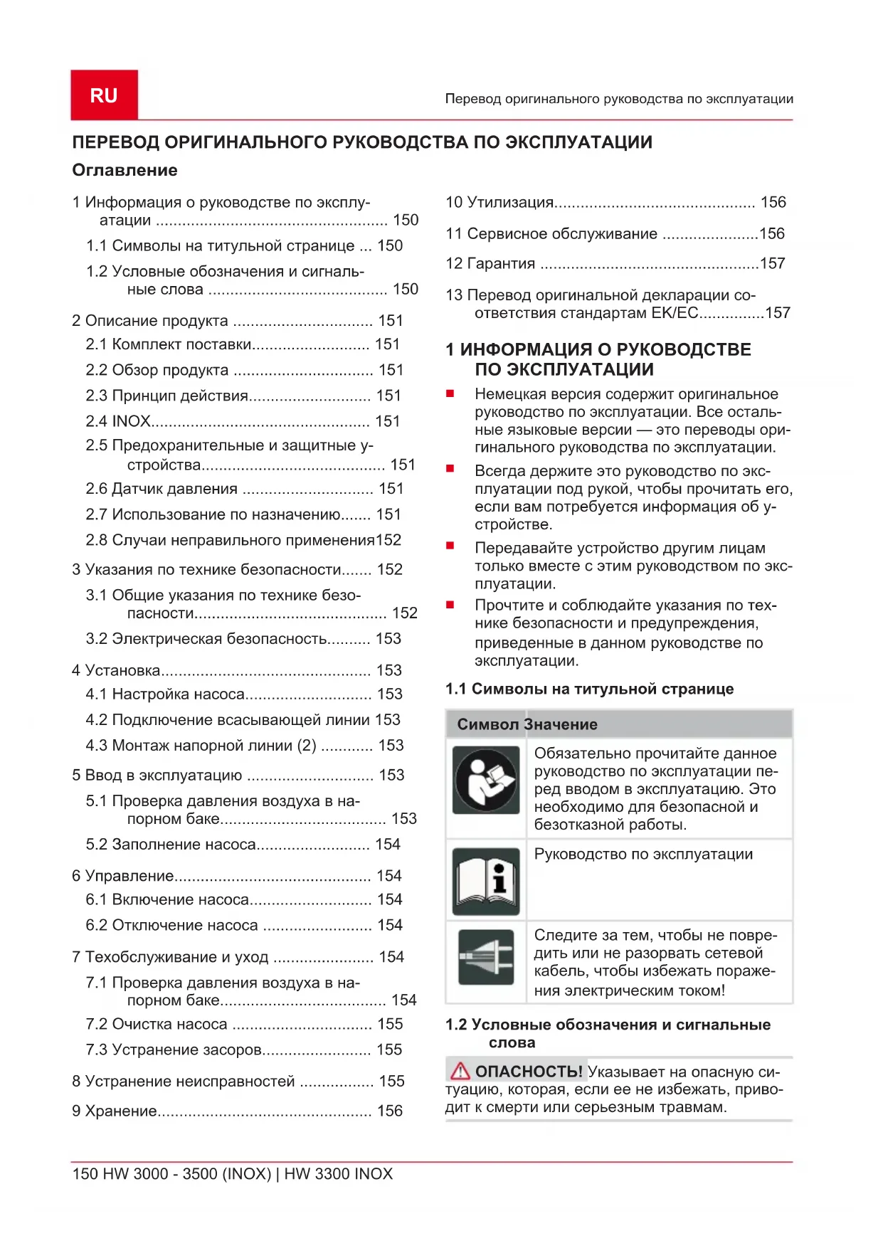 ОПАСНОСТЬ! Указывает на опасную си- туацию, которая, если ее не избежать, приво- дит к смерти или серьезным травмам.477032_h 151 Описание продукта ПРЕДУПРЕЖДЕНИЕ! Указывает на по- тенциально опасную ситуацию, которая, если ее не избежать, может привести к смерти или серьезным травмам. ОСТОРОЖНО! Указывает на потенциаль- но опасную ситуацию, которая, если ее не из- бежать, может привести травмам легкой и средней тяжести. ВНИМАНИЕ! Указывает на ситуацию, кото- рая, если ее не избежать, может привести к и- мущественному ущербу. ПРИМЕЧАНИЕ Специальные указания для облегчения понимания и эксплуатации. 2 ОПИСАНИЕ ПРОДУКТА В этом руководстве по эксплуатации описаны разные модели насосов. Нужную модель мож- но идентифицировать по номеру на заводской