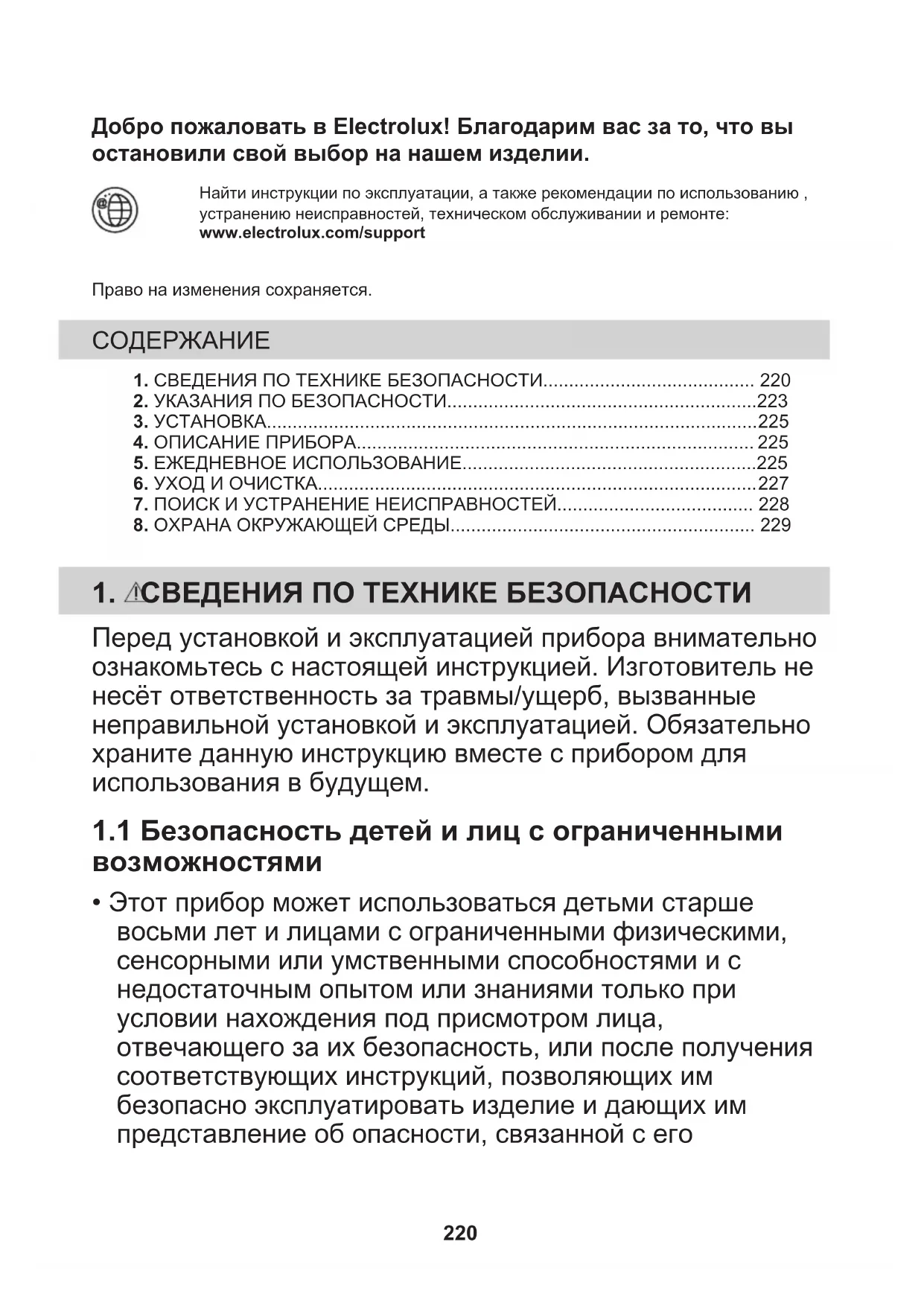 - Этот прибор может использоваться детьми старше восьми лет и лицами с ограниченными физическими, сенсорными или умственными способностями и с недостаточным опытом или знаниями только при условии нахождения под присмотром лица, отвечающего за их безопасность, или после получения соответствующих инструкций, позволяющих им безопасно эксплуатировать изделие и дающих им представление об опасности, связанной с его 220эксплуатацией. Детям младше 8 лет и лицам с ярко выраженными и комплексными нарушениями здоровья запрещается находиться рядом с прибором без постоянного присмотра.