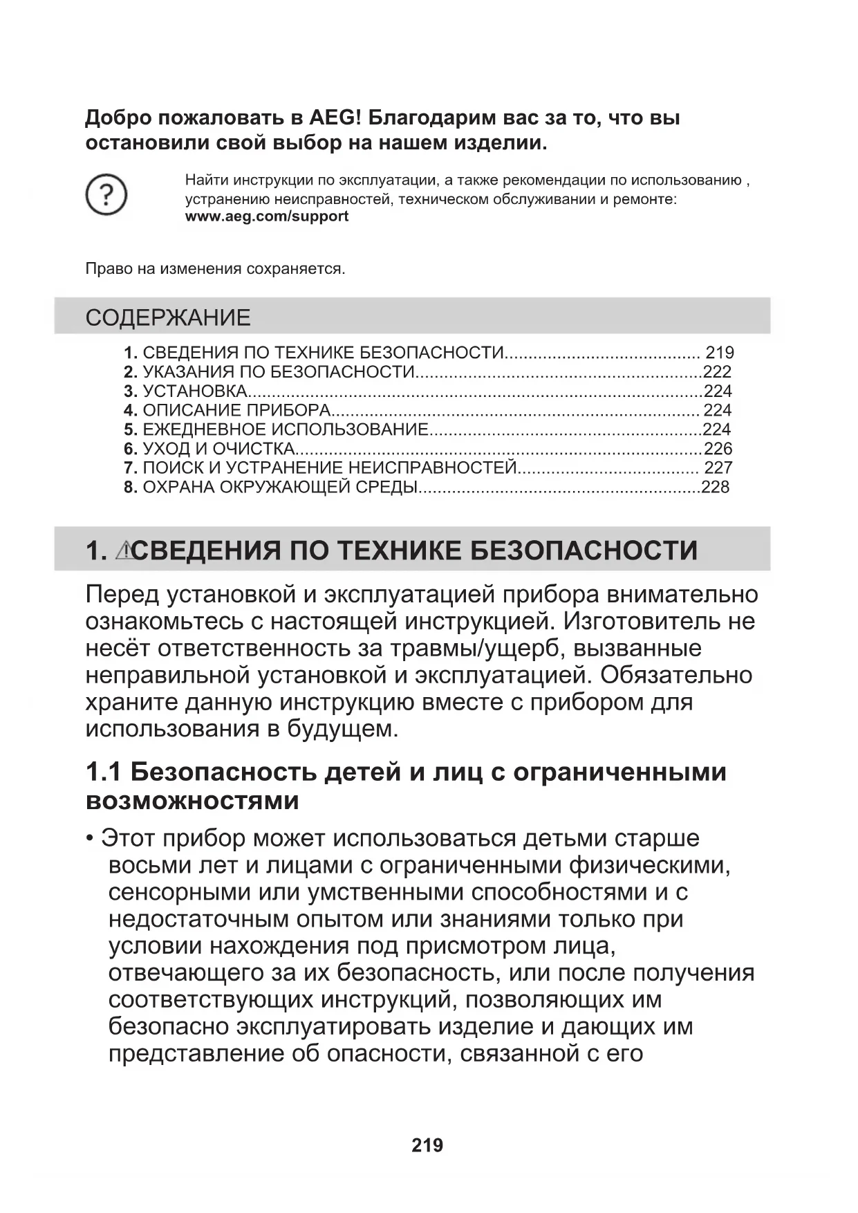 - Этот прибор может использоваться детьми старше восьми лет и лицами с ограниченными физическими, сенсорными или умственными способностями и с недостаточным опытом или знаниями только при условии нахождения под присмотром лица, отвечающего за их безопасность, или после получения соответствующих инструкций, позволяющих им безопасно эксплуатировать изделие и дающих им представление об опасности, связанной с его 219эксплуатацией. Детям младше 8 лет и лицам с ярко выраженными и комплексными нарушениями здоровья запрещается находиться рядом с прибором без постоянного присмотра.
