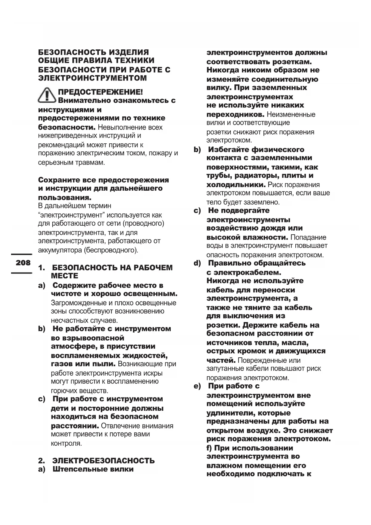 a) Содержите рабочее место в чистоте и хорошо освещенным. Загроможденные и плохо освещенные зоны способствуют возникновению несчастных случаев. b) Не работайте с инструментом во взрывоопасной атмосфере, в присутствии воспламеняемых жидкостей, газов или пыли. Возникающие при работе электроинструмента искры могут привести к воспламенению горючих веществ. c) При работе с инструментом дети и посторонние должны находиться на безопасном расстоянии. Отвлечение внимания может привести к потере вами
