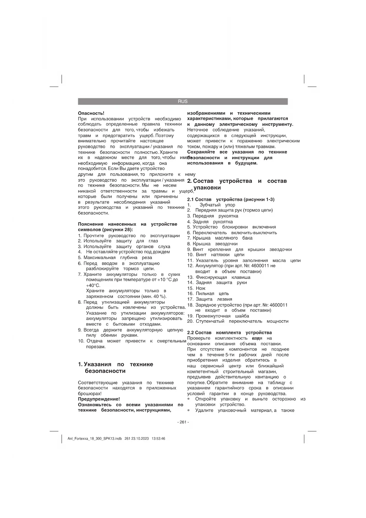 неправильно - натяжение цепи слишком слабое - цепь затуплена - цепь изношена - зубья пилы направлены в неправильную сторону - отрегулировать натяжение цепи - цепь подточить или заменить - цепь заменить - пильную цепь перемонтировать, зубьями в правильном направлении Anl_Fortexxa_18_300_SPK13.indb 270 23.10.2023 13:53:49RUS