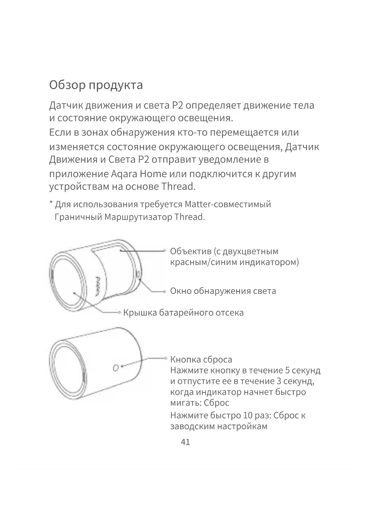- Для использования требуется Matter-совместимый Граничный Маршрутизатор Thread. Датчик движения и света P2 определяет движение тела и состояние окружающего освещения. Если в зонах обнаружения кто-то перемещается или изменяется состояние окружающего освещения, Датчик Движения и Света P2 отправит уведомление в приложение Aqara Home или подключится к другим устройствам на основе Thread. Обзор продукта Объектив (с двухцветным красным/синим индикатором) Окно обнаружения света Крышка батарейного отсека Кнопка сброса Нажмите кнопку в течение 5 секунд и отпустите ее в течение 3 секунд, когда индикатор начнет быстро мигать: Сброс Нажмите быстро 10 раз: Сброс к заводским настройкам42