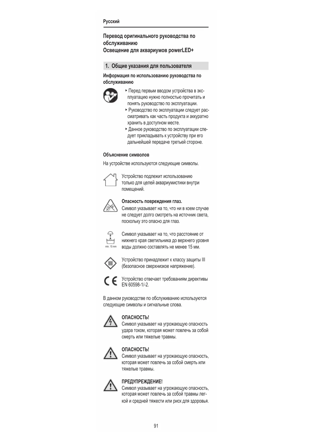 Опасность повреждения глаз. Символ указывает на то, что ни в коем случае не следует долго смотреть на источник света, поскольку это опасно для глаз. Символ указывает на то, что расстояние от нижнего края светильника до верхнего уровня воды должно составлять не менее 15 мм. Устройство принадлежит к классу защиты III (безопасное сверхнизкое напряжение). Устройство отвечает требованиям директивы EN 60598-1/-2. В данном руководстве по обслуживанию используются следующие символы и сигнальные слова. ОПAСНОСТЬ! Символ указывает на угрожающую опасность удара током, которая может повлечь за собой смерть или тяжелые травмы. ОПAСНОСТЬ! Символ указывает на угрожающую опасность, которая может повлечь за собой смерть или тяжелые травмы. ПРЕДУПРЕЖДЕНИЕ! Символ указывает на угрожающую опасность, которая может повлечь за собой травмы лег- кой и средней тяжести или риск для здоровья. min. 15 mmРусский