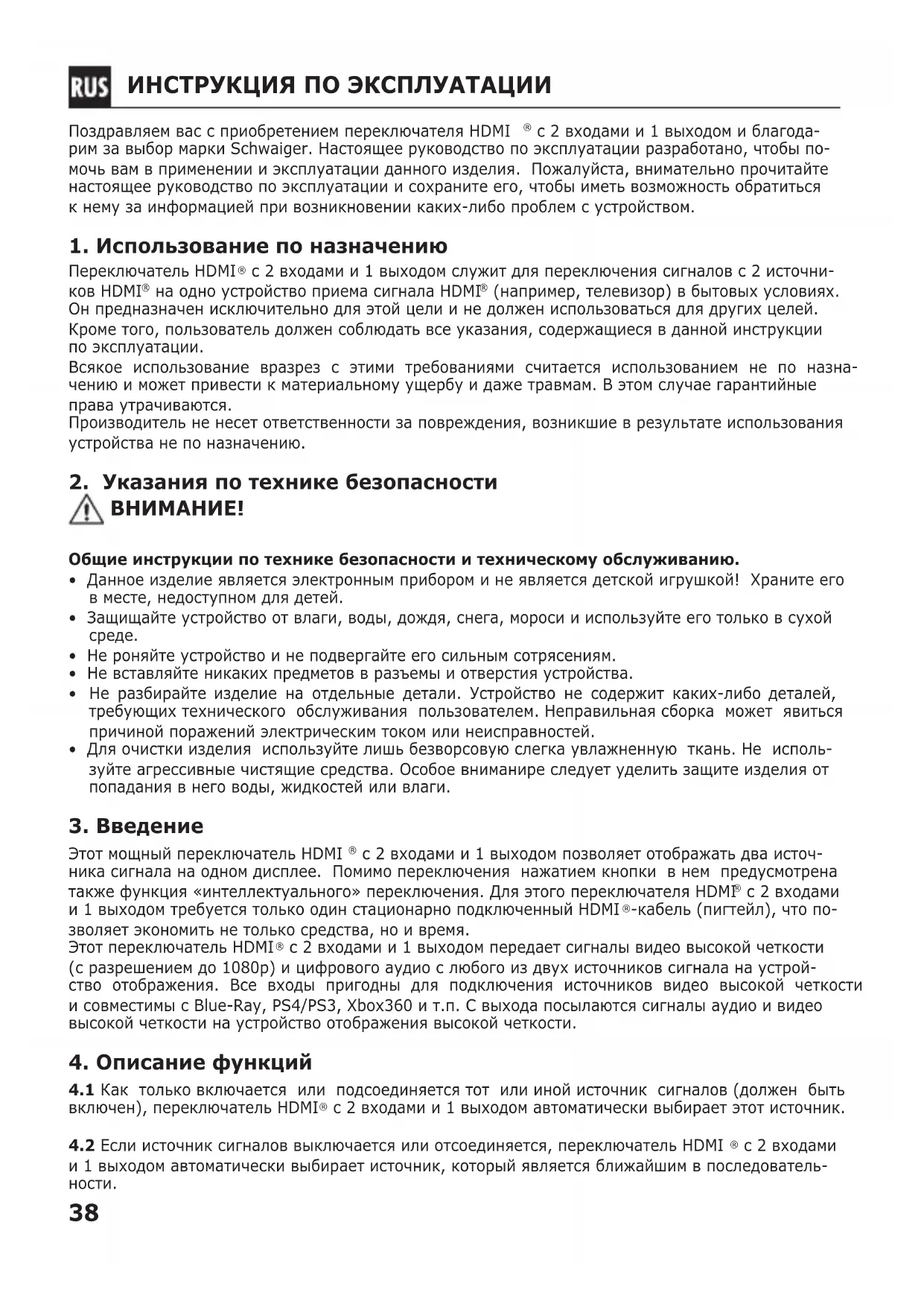с 2 входами и 1 выходом и благода- рим за выбор марки Schwaiger. Настоящее руководство по эксплуатации разработано, чтобы по- мочь вам в применении и эксплуатации данного изделия. Пожалуйста, внимательно прочитайте настоящее руководство по эксплуатации и сохраните его, чтобы иметь возможность обратиться к нему за информацией при возникновении каких-либо проблем c устройством. 1.Использованиепоназначению Переключатель HDMI