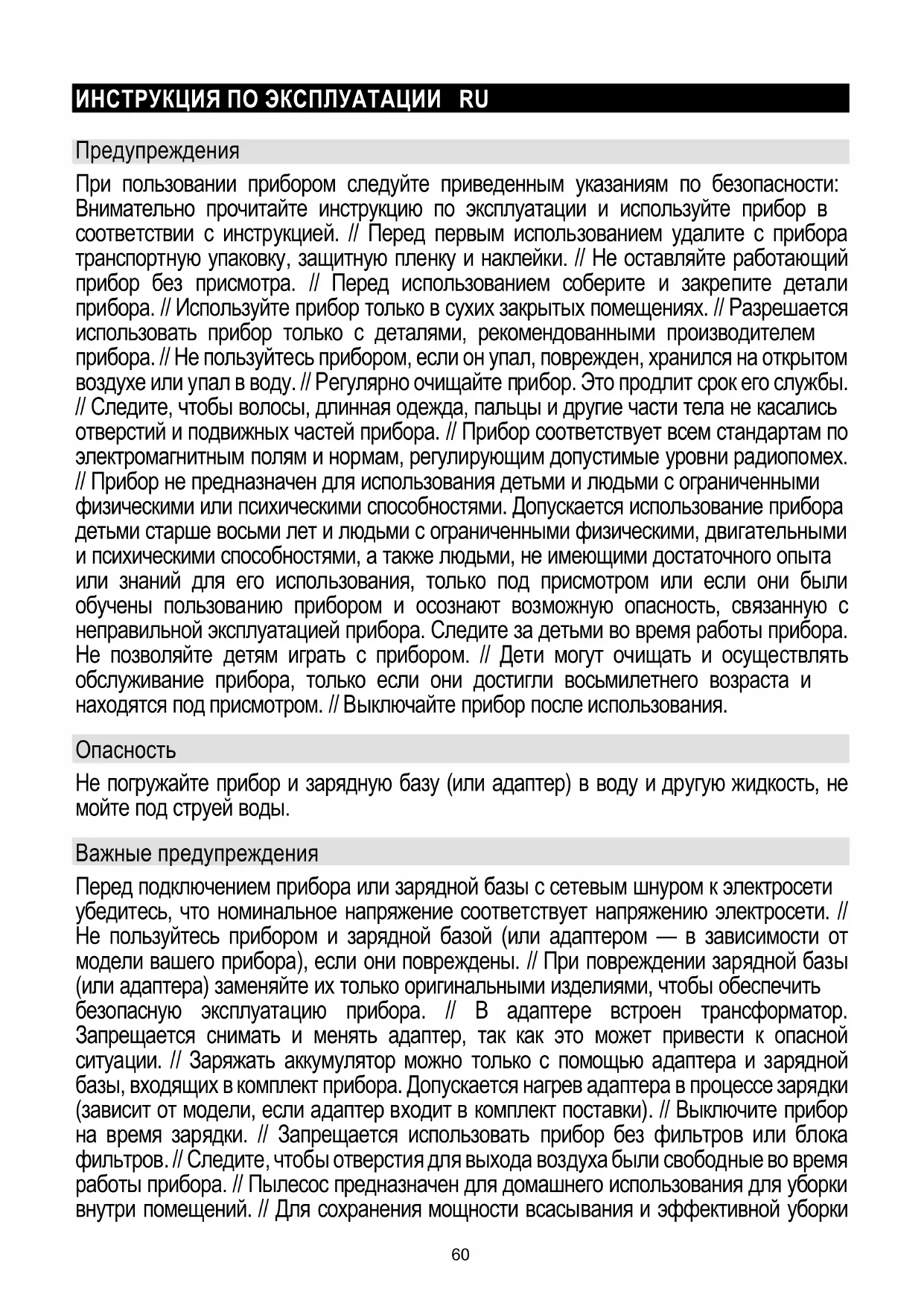 Перевірте, чи не блокує сміття подачу потоку повітря в шланг. Див. короткий посібник, щоб зняти валик правильно. Від'єднайте валик від щітки й очистіть щітку. Переконайтеся, що в шланзі більше немає сміття. Помилка 109 Час заряджання від зарядного пристрою перевищує 6 годин, що свідчить про його несправність. Потрібна заміна зарядного пристрою. Помилка 110 Захист від перенапруги всмоктувального мотора. Прилад потрібно відправити для ремонту кваліфікованим персоналом. Помилка 111 Захист від перевантаження по струму всмоктувального мотора. Прилад потрібно відправити для ремонту кваліфікованим персоналом. Помилка 112 Захист від перегріву всмоктувального мотора, що призводить до автоматичного вимкнення приладу. Прилад потрібно відправити для ремонту кваліфікованим персоналом. Потік повітря заблокований Перевантаження мотора під час роботи приладу на високій швидкості. Шланг заблоковано. // Фільтр заблоковано. // Примітка. Перед використанням переконайтеся, що сітка фільтра, фільтр і пилезбірник зібрані сухими. Помилка 120 Якщо фільтр і пилезбірник відсутні, пилосос не працюватиме. 59ИНСТРУКЦИЯ ПО ЭКСПЛУАТАЦИИ RU Предупреждения При пользовании прибором следуйте приведенным указаниям по безопасности: Внимательно прочитайте инструкцию по эксплуатации и используйте прибор в соответствии с инструкцией. // Перед первым использованием удалите с прибора транспортную упаковку, защитную пленку и наклейки. // Не оставляйте работающий прибор без присмотра. // Перед использованием соберите и закрепите детали прибора. // Используйте прибор только в сухих закрытых помещениях. // Разрешается использовать прибор только с деталями, рекомендованными производителем прибора. // Не пользуйтесь прибором, если он упал, поврежден, хранился на открытом воздухе или упал в воду. // Регулярно очищайте прибор. Это продлит срок его службы. // Следите, чтобы волосы, длинная одежда, пальцы и другие части тела не касались отверстий и подвижных частей прибора. // Прибор соответствует всем стандартам по электромагнитным полям и нормам, регулирующим допустимые уровни радиопомех. // Прибор не предназначен для использования детьми и людьми с ограниченными физическими или психическими способностями. Допускается использование прибора детьми старше восьми лет и людьми с ограниченными физическими, двигательными и психическими способностями, а также людьми, не имеющими достаточного опыта или знаний для его использования, только под присмотром или если они были обучены пользованию прибором и осознают возможную опасность, связанную с неправильной эксплуатацией прибора. Следите за детьми во время работы прибора. Не позволяйте детям играть с прибором. // Дети могут очищать и осуществлять обслуживание прибора, только если они достигли восьмилетнего возраста и находятся под присмотром. // Выключайте прибор после использования.