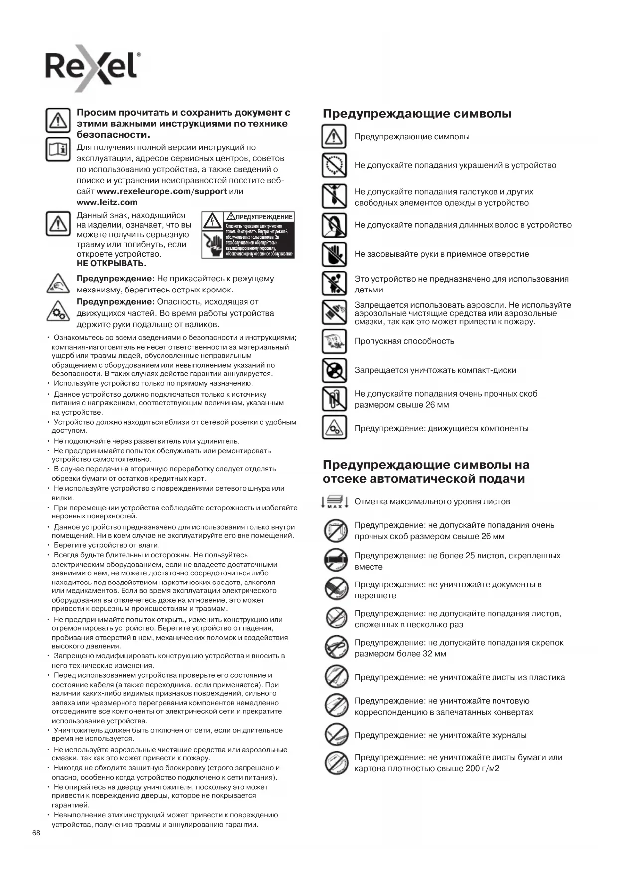 - Ознакомьтесь со всеми сведениями о безопасности и инструкциями; компания-изготовитель не несет ответственности за материальный ущерб или травмы людей, обусловленные неправильным обращением с оборудованием или невыполнением указаний по безопасности. В таких случаях действе гарантии аннулируется.• Используйте устройство только по прямому назначению.• Данное устройство должно подключаться только к источнику питания с напряжением, соответствующим величинам, указанным на устройстве.• Устройство должно находиться вблизи от сетевой розетки с удобным доступом.• Не подключайте через разветвитель или удлинитель.• Не предпринимайте попыток обслуживать или ремонтировать устройство самостоятельно.• В случае передачи на вторичную переработку следует отделять обрезки бумаги от остатков кредитных карт.• Не используйте устройство с повреждениями сетевого шнура или вилки.• При перемещении устройства соблюдайте осторожность и избегайте неровных поверхностей.• Данное устройство предназначено для использования только внутри помещений. Ни в коем случае не эксплуатируйте его вне помещений.• Берегите устройство от влаги.• Всегда будьте бдительны и осторожны. Не пользуйтесь электрическим оборудованием, если не владеете достаточными знаниями о нем, не можете достаточно сосредоточиться либо находитесь под воздействием наркотических средств, алкоголя или медикаментов. Если во время эксплуатации электрического оборудования вы отвлечетесь даже на мгновение, это может привести к серьезным происшествиям и травмам.• Не предпринимайте попыток открыть, изменить конструкцию или отремонтировать устройство. Берегите устройство от падения, пробивания отверстий в нем, механических поломок и воздействия высокого давления.• Запрещено модифицировать конструкцию устройства и вносить в него технические изменения.• Перед использованием устройства проверьте его состояние и состояние кабеля (а также переходника, если применяется). При наличии каких-либо видимых признаков повреждений, сильного запаха или чрезмерного перегревания компонентов немедленно отсоедините все компоненты от электрической сети и прекратите использование устройства.• Уничтожитель должен быть отключен от сети, если он длительное время не используется.• Не используйте аэрозольные чистящие средства или аэрозольные смазки, так как это может привести к пожару.• Никогда не обходите защитную блокировку (строго запрещено и опасно, особенно когда устройство подключено к сети питания).• Не опирайтесь на дверцу уничтожителя, поскольку это может привести к повреждению дверцы, которое не покрывается гарантией.• Невыполнение этих инструкций может привести к повреждению устройства, получению травмы и аннулированию гарантии. Просим прочитать и сохранить документ с этими важными инструкциями по технике безопасности. Для получения полной версии инструкций по эксплуатации, адресов сервисных центров, советов по использованию устройства, а также сведений о поиске и устранении неисправностей посетите веб- сайт www.rexeleurope.com/support или www.leitz.com Не допускайте попадания украшений в устройство Не допускайте попадания галстуков и других свободных элементов одежды в устройство Предупреждающие символы Не допускайте попадания длинных волос в устройство Не засовывайте 