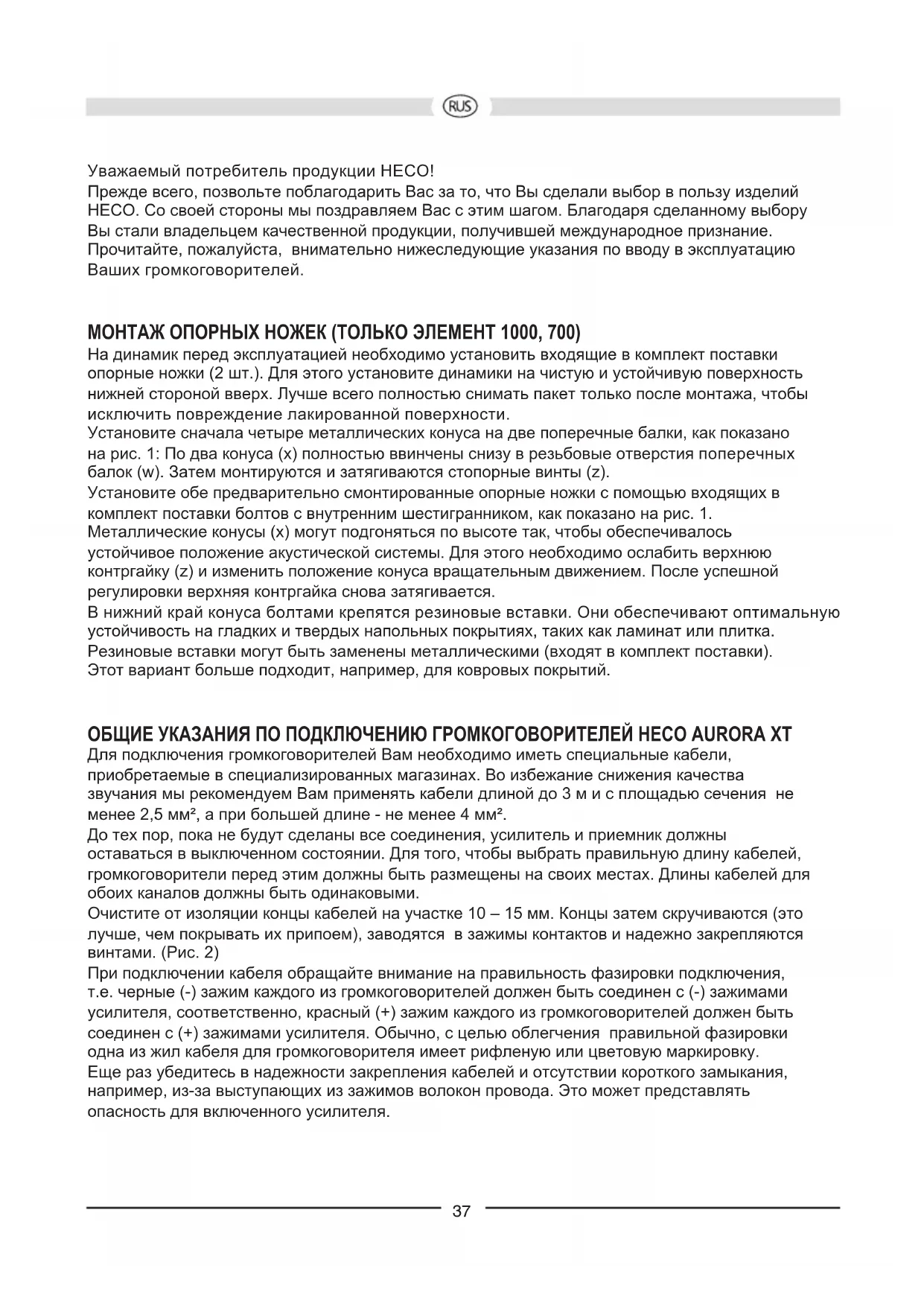 Konguration: 2 vägs basreex 2 vägs basreex Max belastning: 80 / 150 W 90 / 150 W Impedans: 4 – 8 ohm 4 – 8 ohm Frekvensområde: 32 – 42 500 Hz 34– 42 500 Hz Rekommenderad förstärkareffekt: 20 – 150 W 20 – 150 W Verkningsgrad (2.8V/1m): 90 dB 90 dB Mått (BxHxD): 195 x 357 x 333 mm 490 x 177 x 303 mm Tillbehör: Hårdgummi-spikes Hårdgummi-spikes VI FÖRBEHÅLLER OSS RÄTTEN TILL TEKNISKA ÄNDRINGAR. 3536Уважаемый потребитель продукции HECO! Прежде всего, позвольте поблагодарить Вас за то, что Вы сделали выбор в пользу изделий HECO. Со своей стороны мы поздравляем Вас с этим шагом. Благодаря сделанному выбору Вы стали владельцем качественной продукции, получившей международное признание. Прочитайте, пожалуйста, внимательно нижеследующие указания по вводу в эксплуатацию Ваших громкоговорителей. МОНТАЖ ОПОРНЫХ НОЖЕК (ТОЛЬКО ЭЛЕМЕНТ 1000, 700) На динамик перед эксплуатацией необходимо установить входящие в комплект поставки опорные ножки (2 шт.). Для этого установите динамики на чистую и устойчивую поверхность нижней стороной вверх. Лучше всего полностью снимать пакет только после монтажа, чтобы исключить повреждение лакированной поверхности. Установите сначала четыре металлических конуса на две поперечные балки, как показано на рис. 1: По два конуса (x) полностью ввинчены снизу в резьбовые отверстия поперечных балок (w). Затем монтируются и затягиваются стопорные винты (z). Установите обе предварительно смонтированные опорные ножки с помощью входящих в комплект поставки болтов с внутренним шестигранником, как показано на рис. 1. Металлические конусы (x) могут подгоняться по высоте так, чтобы обеспечивалось устойчивое положение акустической системы. Для этого необходимо ослабить верхнюю контргайку (z) и изменить положение конуса вращательным движением. После успешной регулировки верхняя контргайка снова затягивается. В нижний край конуса болтами крепятся резиновые вставки. Они обеспечивают оптимальную устойчивость на гладких и твердых напольных покрытиях, таких как ламинат или плитка. Резиновые вставки могут быть заменены металлическими (входят в комплект поставки). Этот вариант больше подходит, например, для ковровых покрытий.