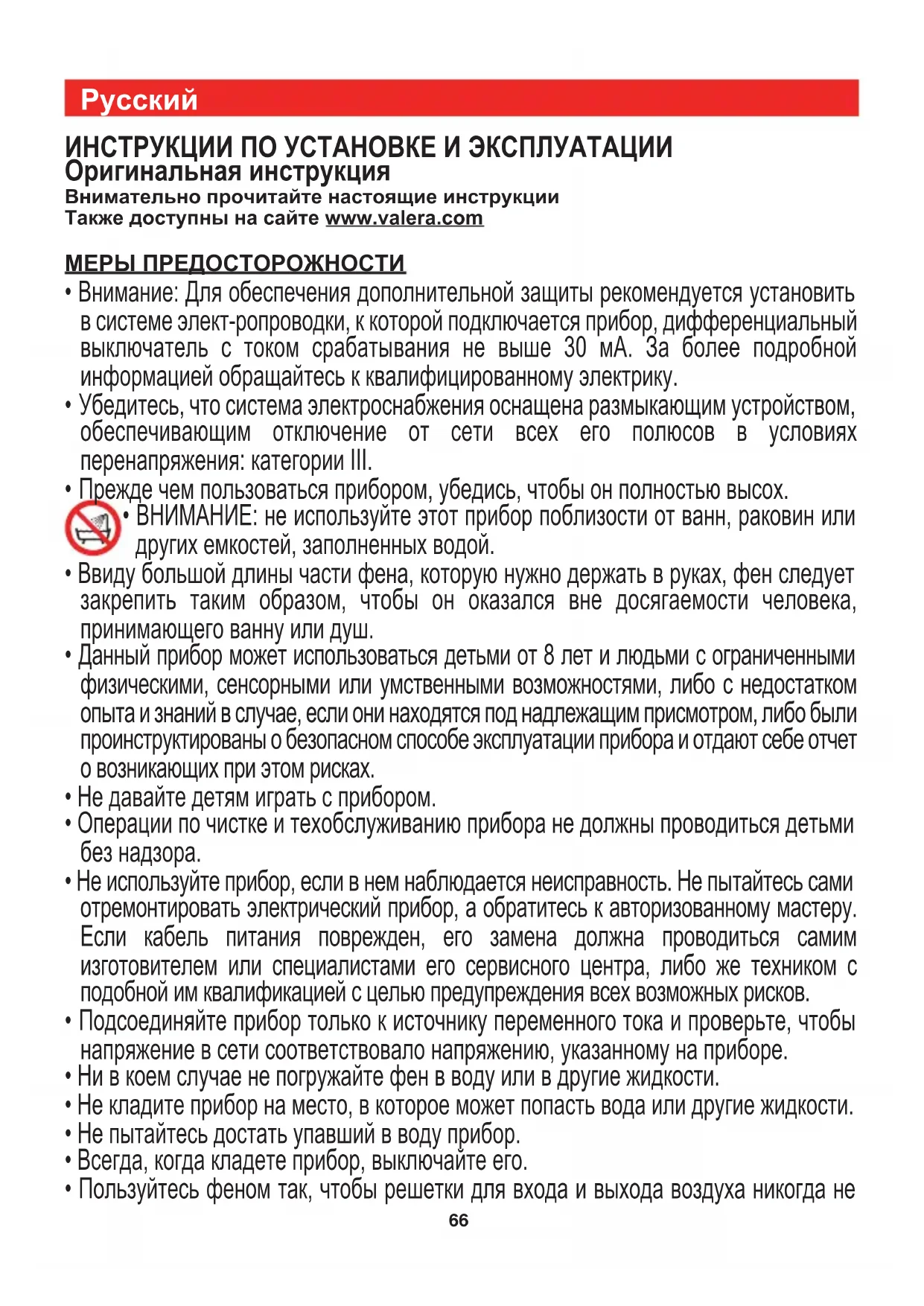 - ВНИМАНИЕ: не используйте этот прибор поблизости от ванн, раковин или других емкостей, заполненных водой.