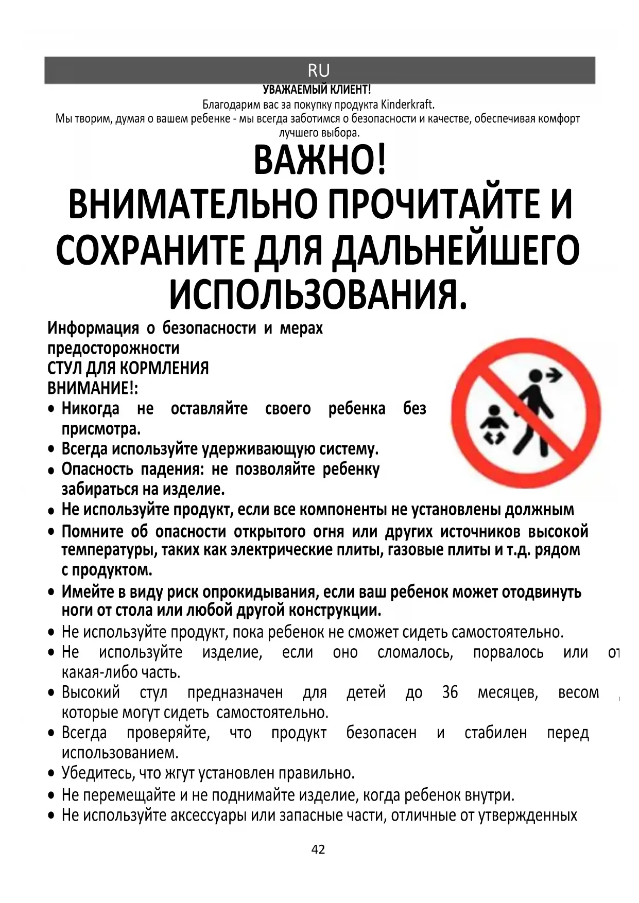 ВНИМАТЕЛЬНО ПРОЧИТАЙТЕ И СОХРАНИТЕ ДЛЯ ДАЛЬНЕЙШЕГО ИСПОЛЬЗОВАНИЯ. Информация о безопасности и мерах предосторожности СТУЛ ДЛЯ КОРМЛЕНИЯ