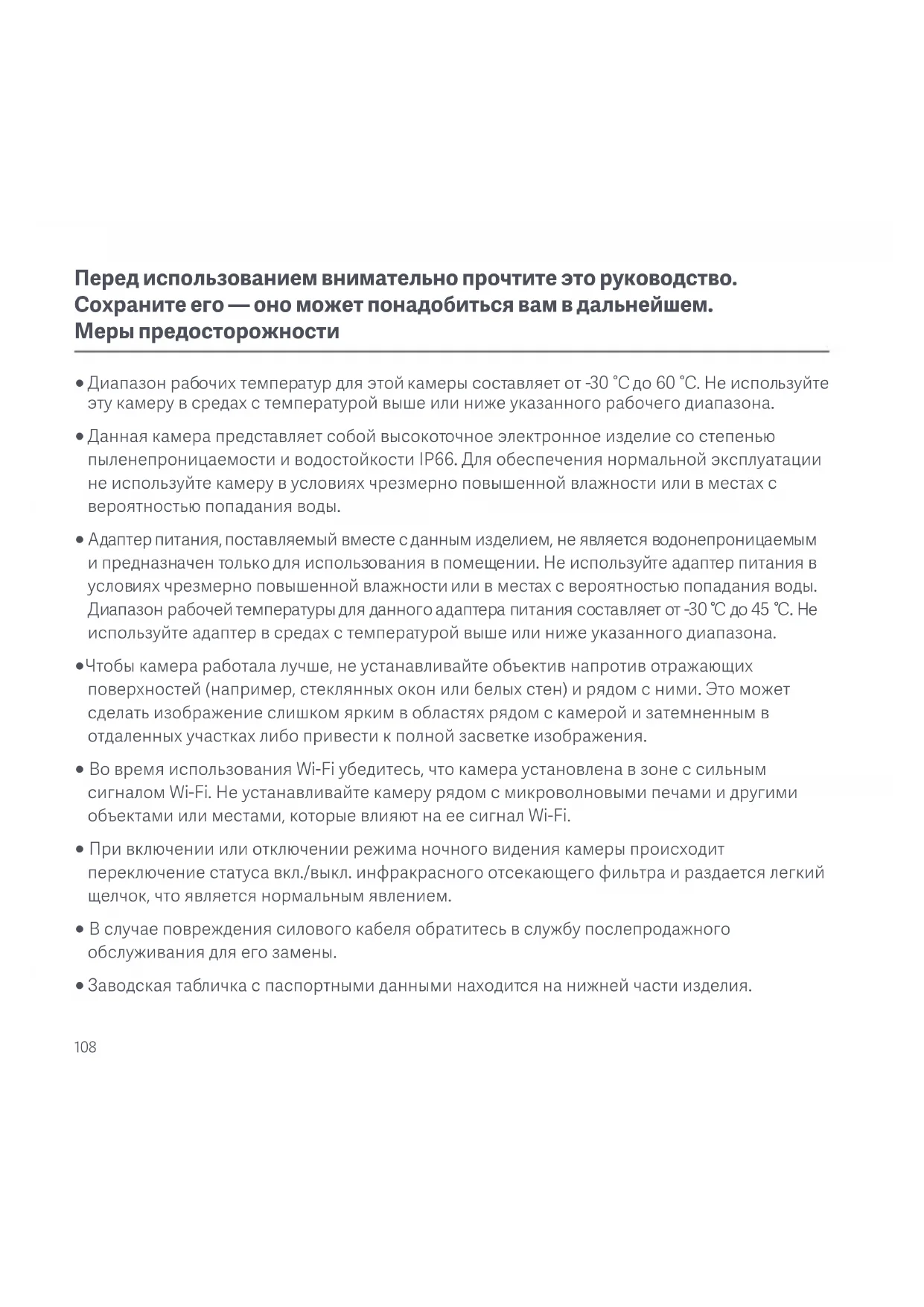 избежать попадания воды (рис. D-5). ПРЕДОСТЕРЕЖЕНИЯ: ○ Стена должна выдерживать вес, по меньшей мере в три раза превышающий общий вес камеры. ○ Во избежание возможных травм камера должна быть надежно закреплена на стене в соответствии с инструкциями по установке. ○ Не устанавливайте рядом с источником тепла, таким как кондиционер, выпускное отверстие вытяжного шкафа или выходное отверстие газового водонагревателя. Установка аксессуаров для герметизации сетевого порта E-1-1. Уплотнительное кольцо E-2-1. Сетевой кабель E-2-2. Водонепроницаемая муфта E-2-3. Стопор E-2-4. Водонепроницаемая задняя крышка112 В комплект аксессуаров для герметизации сетевого порта входят: уплотнительное кольцо, водонепроницаемая муфта, стопор и водонепроницаемая задняя крышка. После установки водонепроницаемость сетевого порта будет повышена. Поместите уплотнительное кольцо на сетевой порт камеры (рис. E-1). Наденьте водонепроницаемую заднюю крышку, стопор и водонепроницаемую муфту на сетевой кабель в указанном порядке (рис. E-2), затем подсоедините сетевой кабель к порту. Соедините водонепроницаемую муфту и уплотнительное кольцо путем вкручивания, затем таким же образом соедините водонепроницаемую заднюю крышку и водонепроницаемую муфту (рис. E-3). Если сетевой кабель не используется, все равно установите герметичные аксессуары сетевого кабеля. Используйте экранированный сетевой кабель. Технические характеристики Рабочая температура: от -30 °C до 60 °C Модель: MBC21 Видеокодек: H.265 Номинальная мощность: 12 В = 1 А Вес нетто: 487 г Разрешение: 2560 × 1440 Название: Камера наружного наблюдения Xiaomi Outdoor Camera CW300 Размеры изделия: 168 × 100 × 123 мм Ночное видение: инфракрасный свет 850 нм × 2, подсветка × 2 Беспроводное подключение: Wi-Fi IEEE 802.11 b/g/n, 2,4 ГГц Рабочий диапазон частот Wi-Fi: 2412–2472 МГц Максимальная выходная мощность Wi-Fi: <20 дБм Хранение данных: карта памяти microSD (8–256 ГБ)/облачное