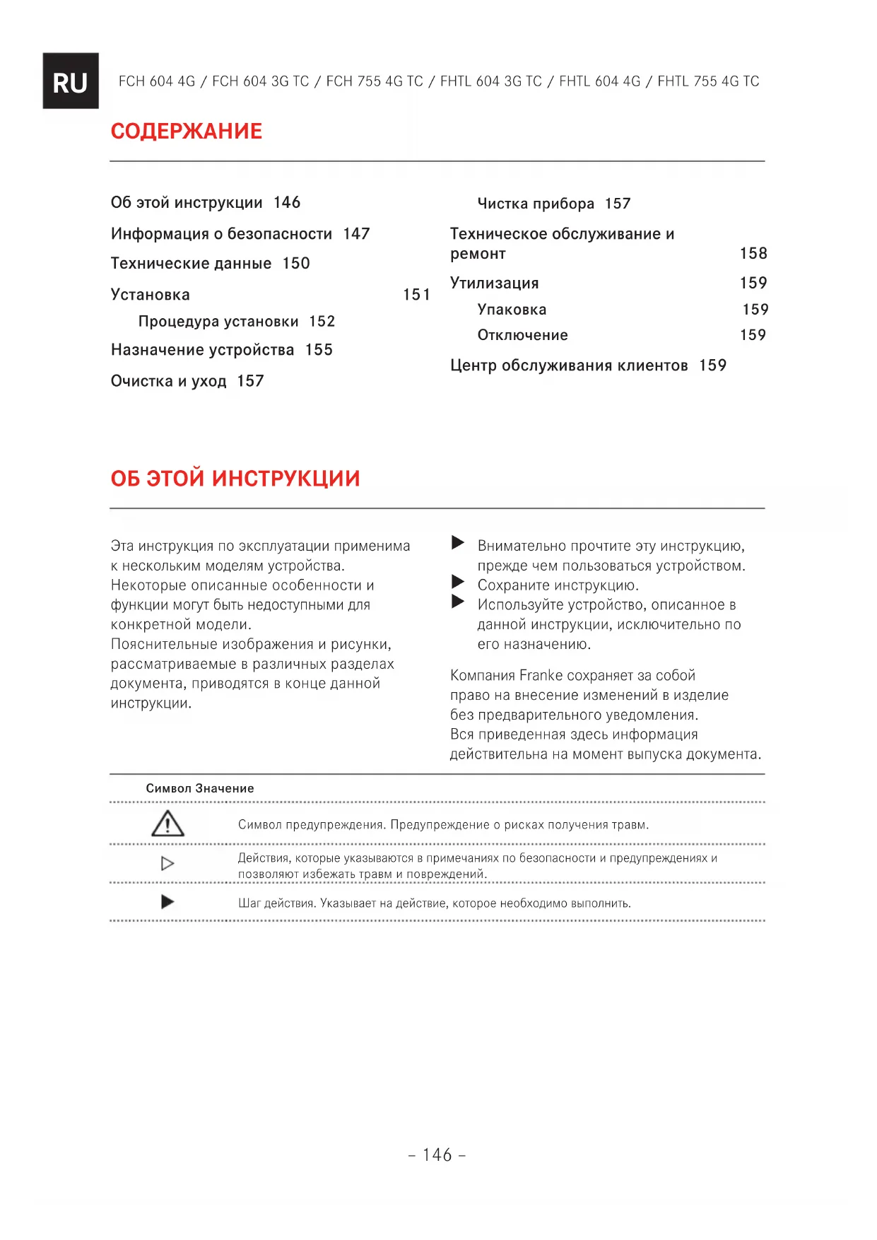 Об этой инструкции 146 Информация о безопасности 147 Технические данные 150 Установка 151 Процедура установки 152 Назначение устройства 155 Очистка и уход 157 Чистка прибора 157 Техническое обслуживание и ремонт 158 Утилизация 159 Упаковка 159 Отключение 159 Центр обслуживания клиентов 159– 147 – FCH 604 4G / FCH 604 3G TC / FCH 755 4G TC / FHTL 604 3G TC / FHTL 604 4G / FHTL 755 4G TC