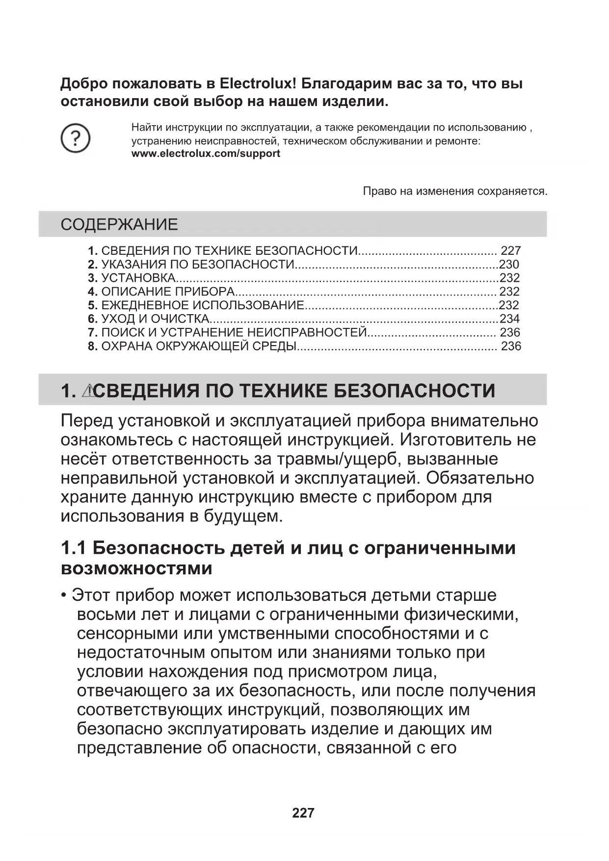 - Этот прибор может использоваться детьми старше восьми лет и лицами с ограниченными физическими, сенсорными или умственными способностями и с недостаточным опытом или знаниями только при условии нахождения под присмотром лица, отвечающего за их безопасность, или после получения соответствующих инструкций, позволяющих им безопасно эксплуатировать изделие и дающих им представление об опасности, связанной с его 227эксплуатацией. Детям младше 8 лет и лицам с ярко выраженными и комплексными нарушениями здоровья запрещается находиться рядом с прибором без постоянного присмотра.