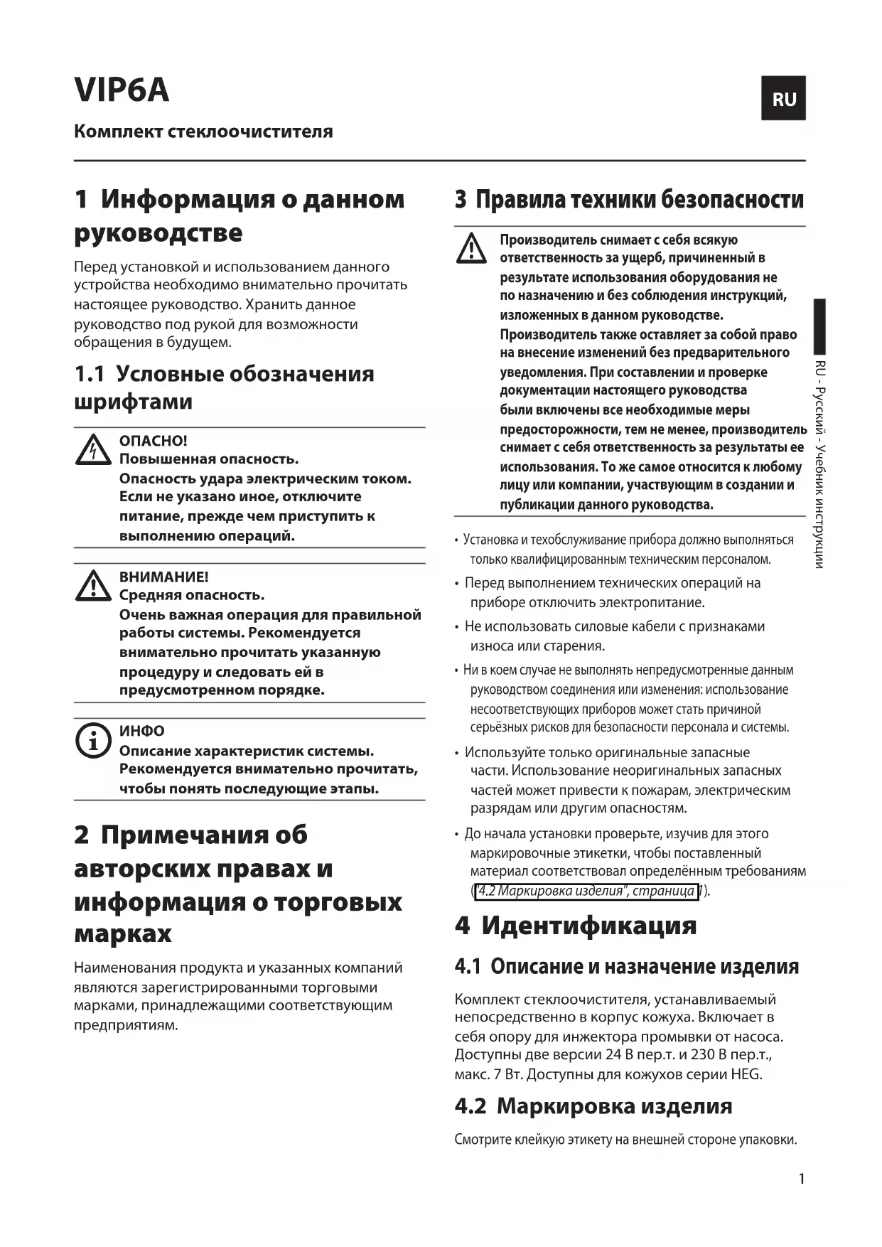 Производитель снимает с себя всякую ответственность за ущерб, причиненный в результате использования оборудования не по назначению и без соблюдения инструкций, изложенных в данном руководстве. Производитель также оставляет за собой право на внесение изменений без предварительного уведомления. При составлении и проверке документации настоящего руководства были включены все необходимые меры предосторожности, тем не менее, производитель снимает с себя ответственность за результаты ее использования. То же самое относится к любому лицу или компании, участвующим в создании и публикации данного руководства.• Установка и техобслуживание прибора должно выполняться только квалифицированным техническим персоналом.• Перед выполнением технических операций на приборе отключить электропитание.• Не использовать силовые кабели с признаками износа или старения. • Ни в коем случае не выполнять непредусмотренные данным руководством соединения или изменения: использование несоответствующих приборов может стать причиной серьёзных рисков для безопасности персонала и системы.• Используйте только оригинальные запасные части. Использование неоригинальных запасных частей может привести к пожарам, электрическим разрядам или другим опасностям. • До начала установки проверьте, изучив для этого маркировочные этикетки, чтобы поставленный материал соответствовал определённым требованиям ("4.2 Маркировка изделия", страница 1)