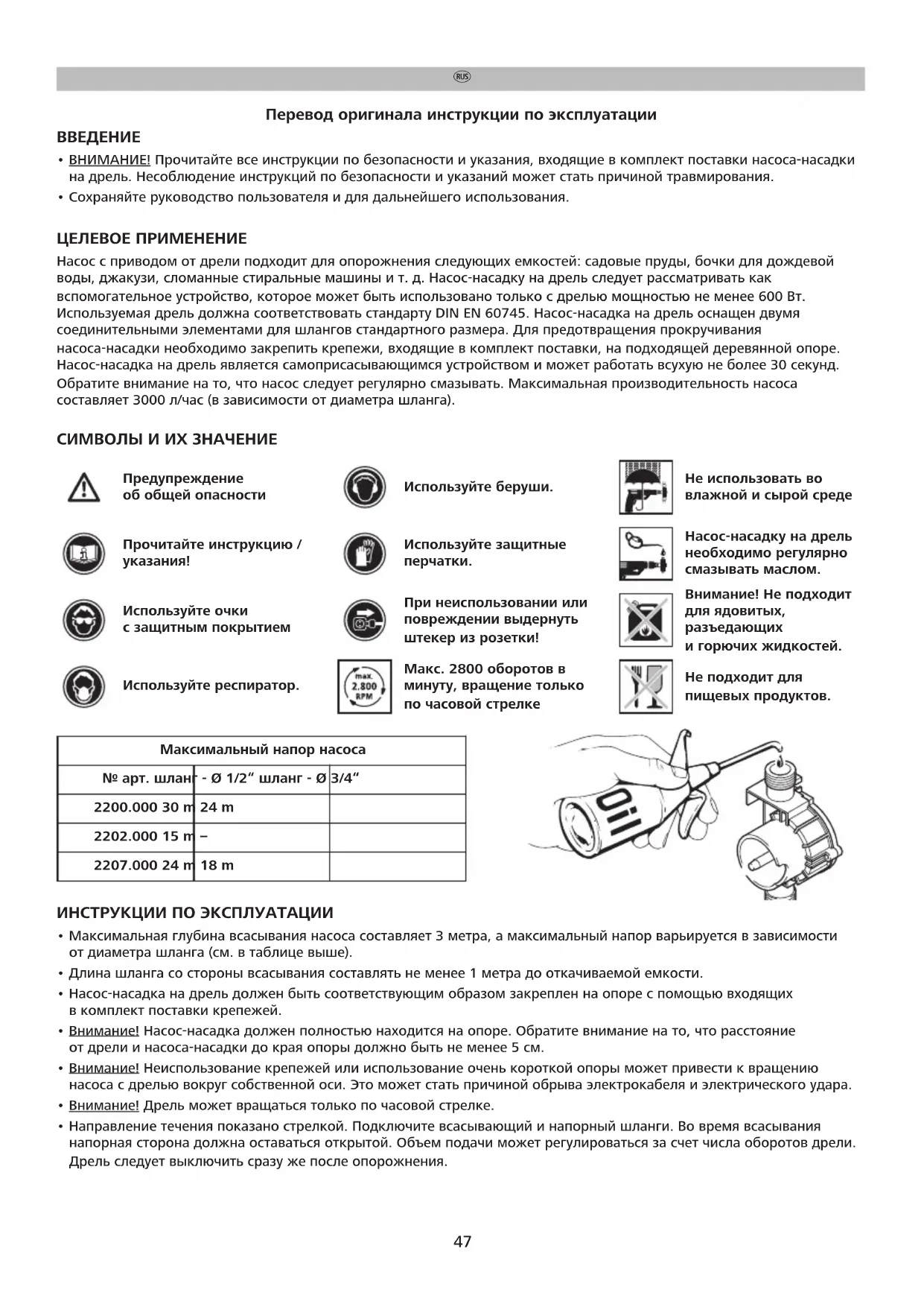 - Направление течения показано стрелкой. Подключите всасывающий и напорный шланги. Во время всасывания напорная сторона должна оставаться открытой. Объем подачи может регулироваться за счет числа оборотов дрели. Дрель следует выключить сразу же после опорожнения. Максимальный напор насоса № арт. шланг - Ø 1/2“ шланг - Ø 3/4“ 2200.000 30 m 24 m 2202.000 15 m – 2207.000 24 m 18 m 47ИНСТРУКЦИИ ПО ТЕХНИКЕ БЕЗОПАСНОСТИ