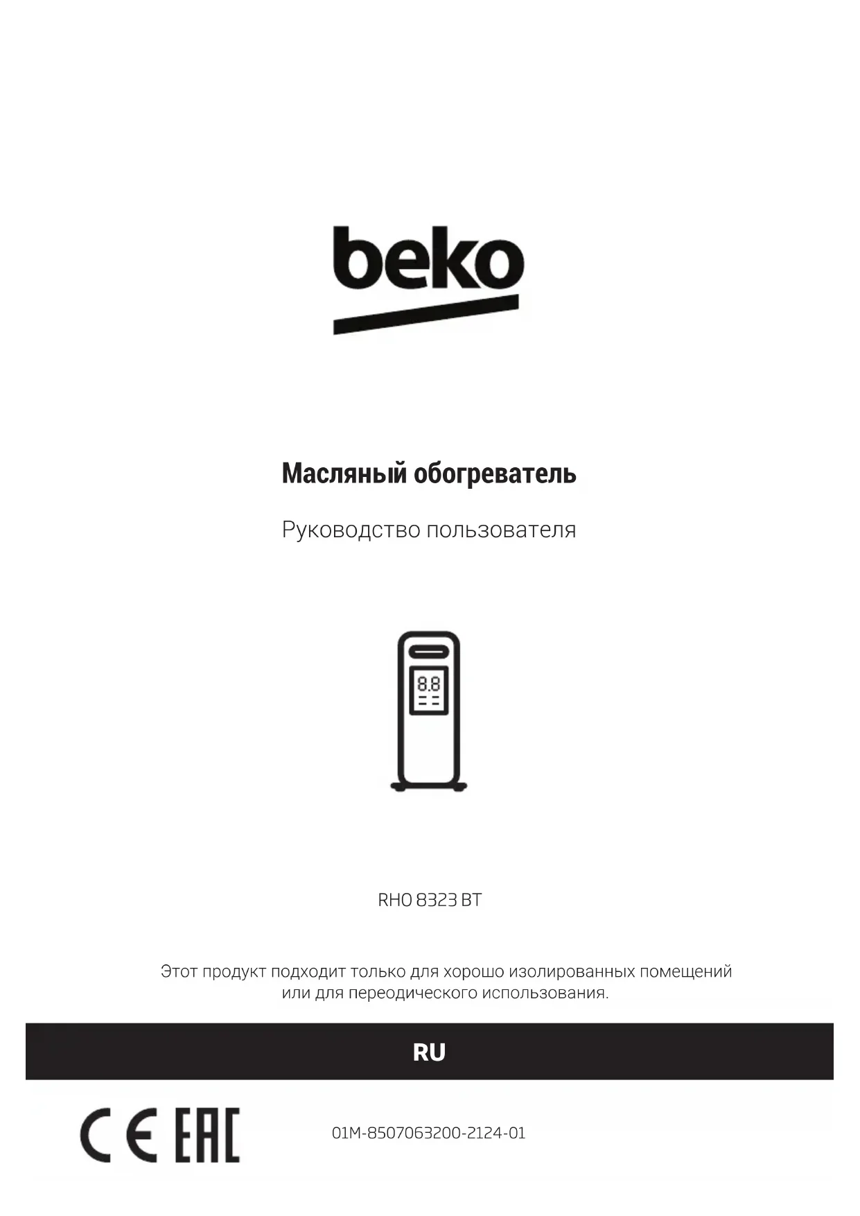 Prima di contattare l’assistenza tecnica, al fine di agevolare la gestione della chiamata, è necessario avere a portata di mano il modello del prodotto e il documento fiscale di acquisto.RU Руководство пользователя Масляный обогреватель 01M-8507063200-2124-01 RHO 8323 BT Этот продукт подходит только для хорошо изолированных помещений или для переодического использования.Сначала прочтите данное руководство по эксплуатации! Уважаемый покупатель, Благодарим Вас за то, что отдали предпочтение изделию Beko. Мы надеемся, что вы получите наилучшие результаты от его использования: прибор был изготовлен с обеспечением высокого качества на базе новейших технологий. Поэтому внимательно прочитайте данное руководство пользователя и все другие сопроводительные документы перед использованием устройства. Рекомендуется сохранить данный документ в качестве справочного пособия для дальнейшего использования. При передаче устройства какому-либо другому лицу приложите к нему руководство пользователя. Соблюдайте все предупреждения и информацию в руководстве пользователя. Значения Символов В различных разделах данного руководства пользователя используются следующие обозначения: