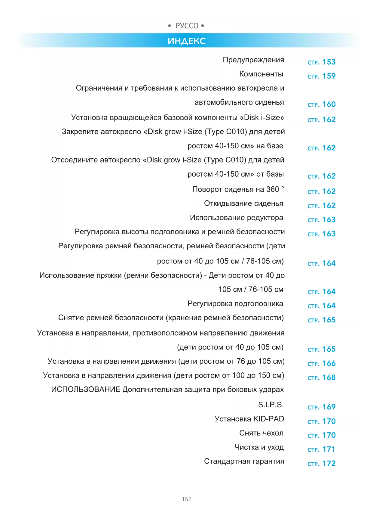 Ограничения и требования к использованию автокресла и автомобильного сиденья Установка вращающейся базовой компоненты «Disk i-Size» Закрепите автокресло «Disk grow i-Size (Type C010) для детей ростом 40-150 см» на базе Отсоедините автокресло «Disk grow i-Size (Type C010) для детей ростом 40-150 см» от базы Поворот сиденья на 360 ° Откидывание сиденья Использование редуктора Регулировка высоты подголовника и ремней безопасности Регулировка ремней безопасности, ремней безопасности (дети ростом от 40 до 105 см / 76-105 см) Использование пряжки (ремни безопасности) - Дети ростом от 40 до 105 см / 76-105 см Регулировка подголовника Снятие ремней безопасности (хранение ремней безопасности) Установка в направлении, противоположном направлению движения (дети ростом от 40 до 105 см) Установка в направлении движения (дети ростом от 76 до 105 см) Установка в направлении движения (дети ростом от 100 до 150 см) ИСПОЛЬЗОВАНИЕ Дополнительная защита при боковых ударах S.I.P.S. Установка KID-PAD Снять чехол Чистка и уход Стандартная гарантия ПРЕДУПРЕЖДЕНИЯ стр. 153 стр. 159 стр. 160 стр. 162 стр. 162 стр. 162 стр. 162 стр. 162 стр. 163 стр. 163 стр. 164 стр. 164 стр. 164 стр. 165 стр. 165 стр. 166 стр. 168 стр. 169 стр. 170 стр. 170 стр. 171 стр. 172• РУССО •