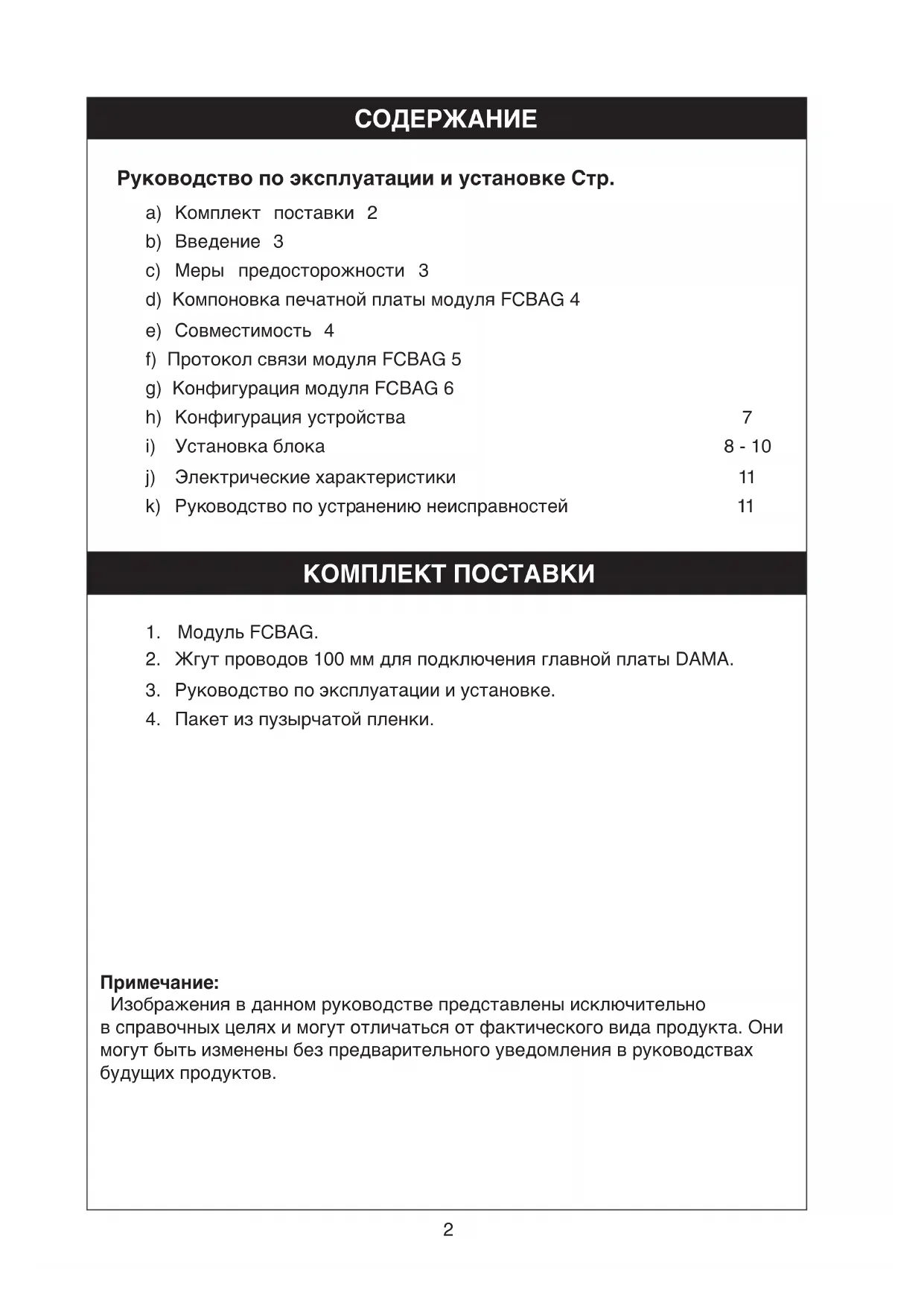 Руководство по эксплуатации и установке Стр. a) Комплект поставки 2 b) Введение 3 c) Меры предосторожности 3 d) Компоновка печатной платы модуля FCBAG 4 e) Совместимость 4 f) Протокол связи модуля FCBAG 5 g) Конфигурация модуля FCBAG 6 h) Конфигурация устройства 7