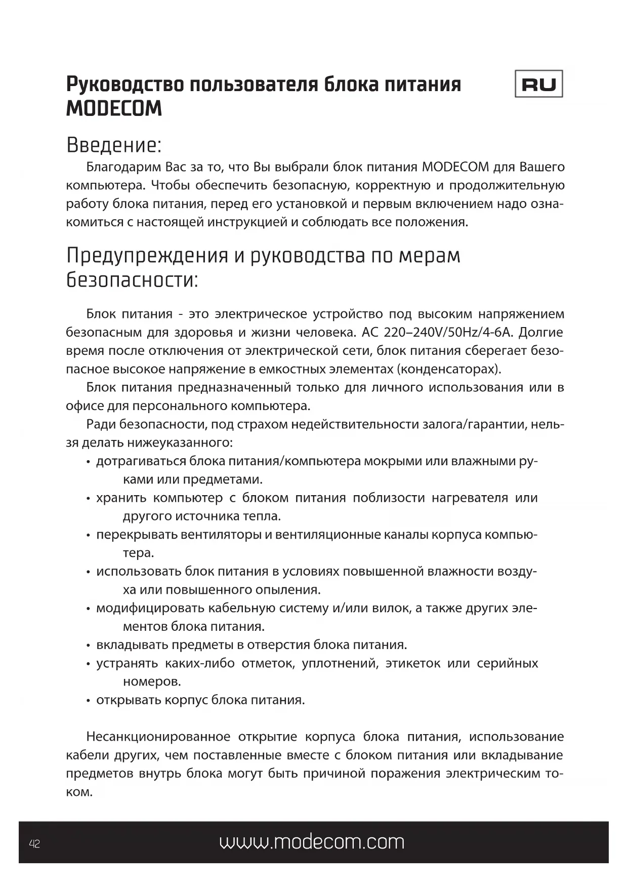 Благодарим Вас за то, что Вы выбрали блок питания MODECOM для Вашего компьютера. Чтобы обеспечить безопасную, корректную и продолжительную работу блока питания, перед его установкой и первым включением надо озна- комиться с настоящей инструкцией и соблюдать все положения. Предупреждения и руководства по мерам безопасности: Блок питания - это электрическое устройство под высоким напряжением безопасным для здоровья и жизни человека. AC 220–240V/50Hz/4-6A. Долгие время после отключения от электрической сети, блок питания сберегает безо- пасное высокое напряжение в емкостных элементах (конденсаторах). Блок питания предназначенный только для личного использования или в офисе для персонального компьютера. Ради безопасности, под страхом недействительности залога/гарантии, нель- зя делать нижеуказанного: