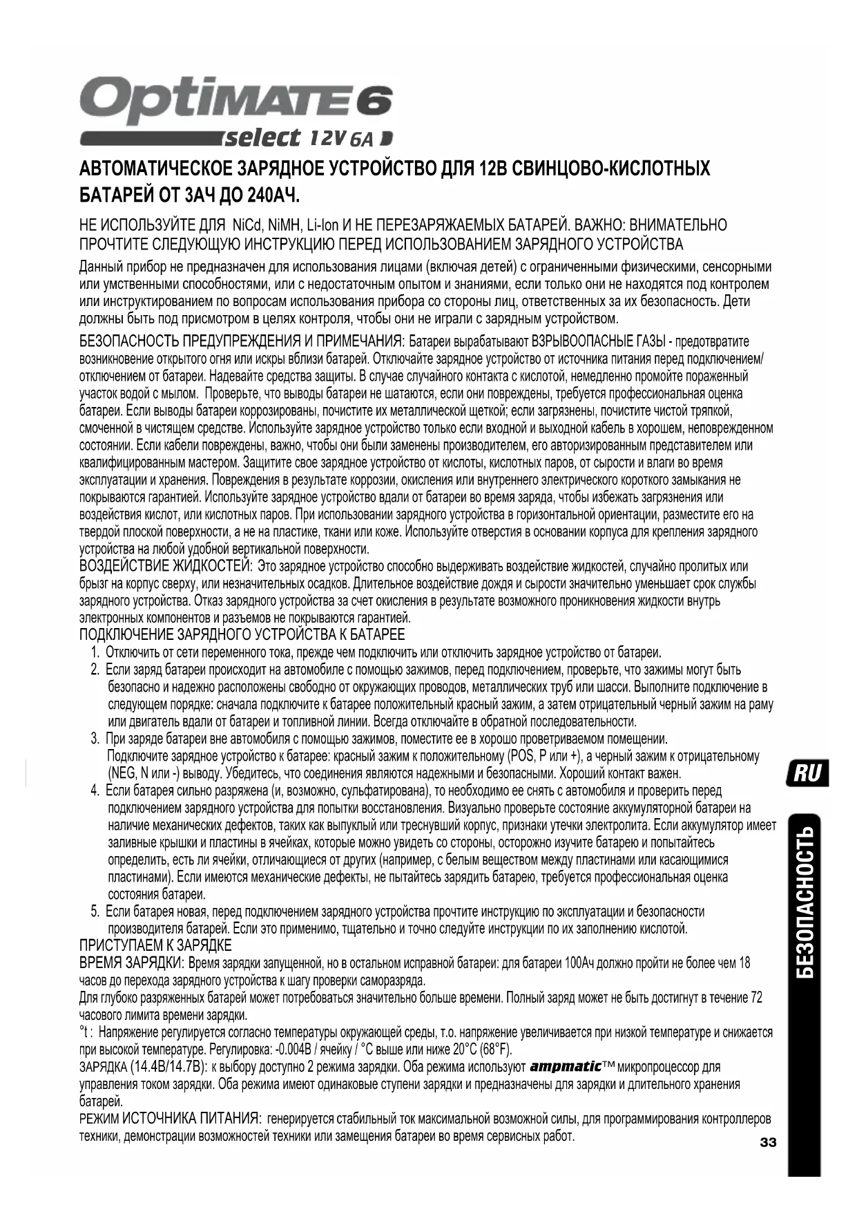 select АВТОМАТИЧЕСКОЕ ЗАРЯДНОЕ УСТРОЙСТВО ДЛЯ 12В СВИНЦОВО-КИСЛОТНЫХ БАТАРЕЙ ОТ 3АЧ ДО 240АЧ. НЕ ИСПОЛЬЗУЙТЕ ДЛЯ NiCd, NiMH, Li-Ion И НЕ ПЕРЕЗАРЯЖАЕМЫХ БАТАРЕЙ. ВАЖНО: ВНИМАТЕЛЬНО ПРОЧТИТЕ СЛЕДУЮЩУЮ ИНСТРУКЦИЮ ПЕРЕД ИСПОЛЬЗОВАНИЕМ ЗАРЯДНОГО УСТРОЙСТВА Данный прибор не предназначен для использования лицами (включая детей) с ограниченными физическими, сенсорными или умственными способностями, или с недостаточным опытом и знаниями, если только они не находятся под контролем или инструктированием по вопросам использования прибора со стороны лиц, ответственных за их безопасность. Дети должны быть под присмотром в целях контроля, чтобы они не играли с зарядным устройством. БЕЗОПАСНОСТЬ ПРЕДУПРЕЖДЕНИЯ И ПРИМЕЧАНИЯ: Батареи вырабатывают ВЗРЫВООПАСНЫЕ ГАЗЫ - предотвратите возникновение открытого огня или искры вблизи батарей. Отключайте зарядное устройство от источника питания перед подключением/ отключением от батареи. Надевайте средства защиты. В случае случайного контакта с кислотой, немедленно промойте пораженный участок водой с мылом. Проверьте, что выводы батареи не шатаются, если они повреждены, требуется профессиональная оценка батареи. Если выводы батареи коррозированы, почистите их металлической щеткой; если загрязнены, почистите чистой тряпкой, смоченной в чистящем средстве. Используйте зарядное устройство только если входной и выходной кабель в хорошем, неповрежденном состоянии. Если кабели повреждены, важно, чтобы они были заменены производителем, его авторизированным представителем или квалифицированным мастером. Защитите свое зарядное устройство от кислоты, кислотных паров, от сырости и влаги во время эксплуатации и хранения. Повреждения в результате коррозии, окисления или внутреннего электрического короткого замыкания не покрываются гарантией. Используйте зарядное устройство вдали от батареи во время заряда, чтобы избежать загрязнения или воздействия кислот, или кислотных паров. При использовании зарядного устройства в горизонтальной ориентации, разместите его на твердой плоской поверхности, а не на пластике, ткани или коже. Используйте отверстия в основании корпуса для крепления зарядного устройства на любой удобной вертикальной поверхности. ВОЗДЕЙСТВИЕ ЖИДКОСТЕЙ: Это зарядное устройство способно выдерживать воздействие жидкостей, случайно пролитых или брызг на корпус сверху, или незначительных осадков. Длительное воздействие дождя и сырости значительно уменьшает срок службы зарядного устройства. Отказ зарядного устройства за счет окисления в результате возможного проникновения жидкости внутрь электронных компонентов и разъемов не покрываются гарантией. ПОДКЛЮЧЕНИЕ ЗАРЯДНОГО УСТРОЙСТВА К БАТАРЕЕ 1. Отключить от сети переменного тока, прежде чем подключить или отключить зарядное устройство от батареи.2. Если заряд батареи происходит на автомобиле с помощью зажимов, перед подключением, проверьте, что зажимы могут быть безопасно и надежно расположены свободно от окружающих проводов, металлических труб или шасси. Выполните подключение в следующем порядке: сначала подключите к батарее положительный красный зажим, а затем отрицательный черный зажим на раму или двигатель вдали от батареи и топливной линии. Всегда отключайте в обратной последовательности.3. При заряде батареи вне автомобиля с 