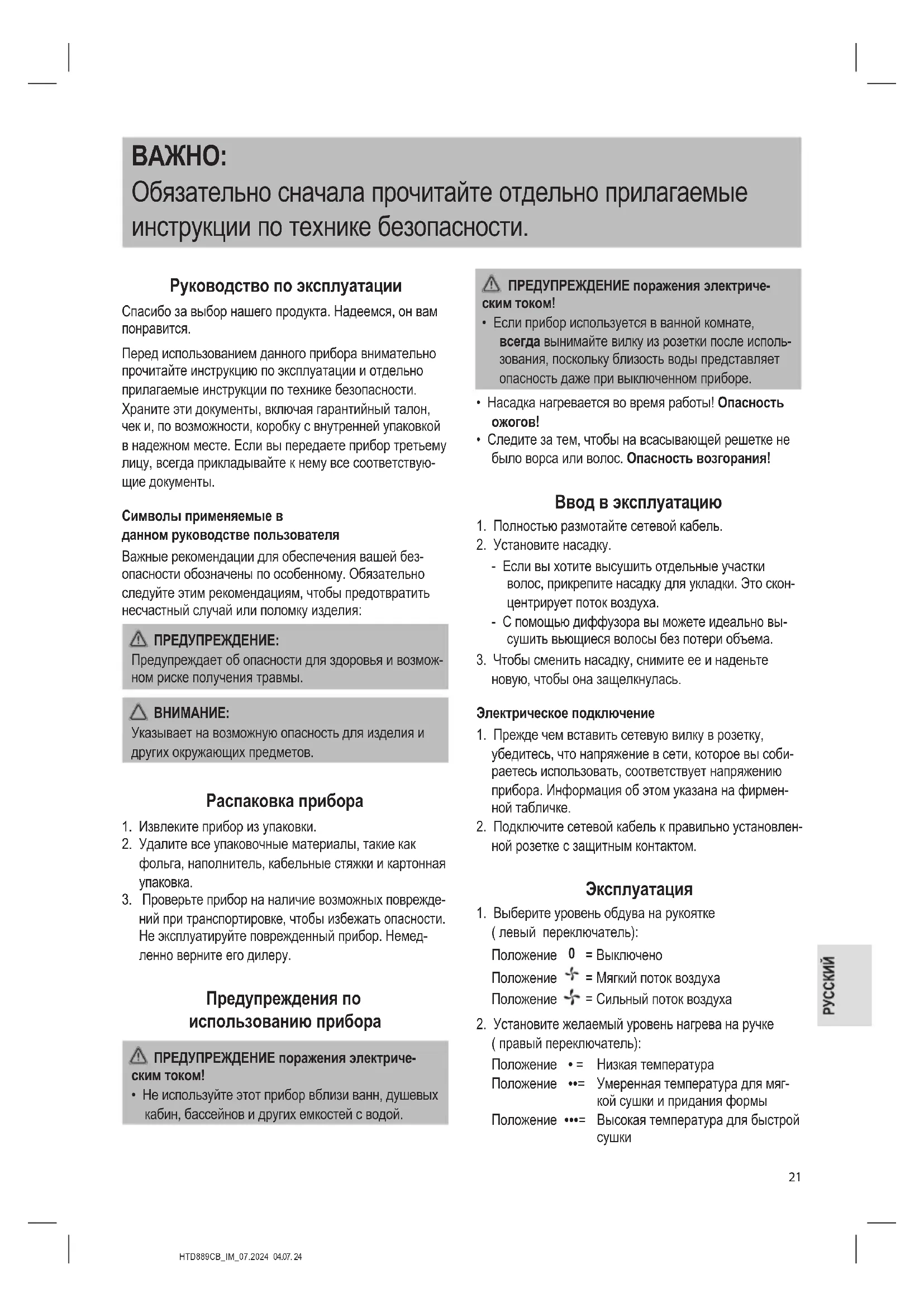 Значение символа «корзина» Защита окружающей среды: не допускается утилизация электроприборов вместе с быто- выми отходами. Утилизация устаревшей техники и неис- правных электроприборов производится в городских приёмных пунктах.HTD889CB_IM_07.2024 04.07. 24