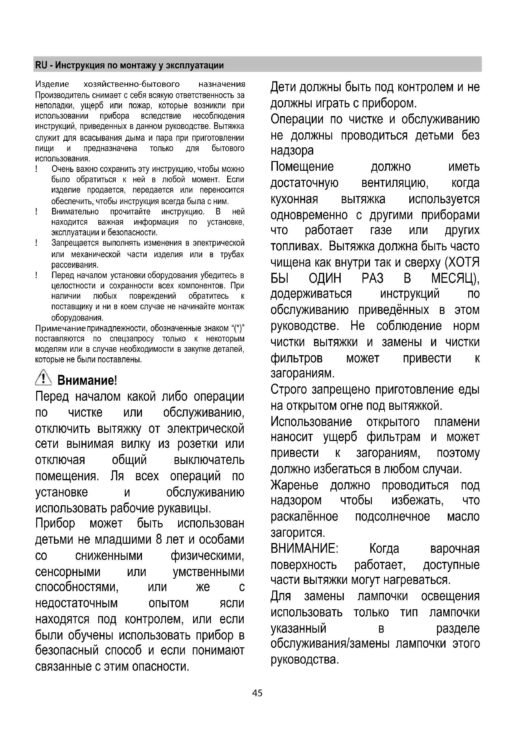 Перед началом какой либо операции по чистке или обслуживанию, отключить вытяжку от электрической сети вынимая вилку из розетки или отключая общий выключатель помещения. Ля всех операций по установке и обслуживанию использовать рабочие рукавицы. Прибор может быть использован детьми не младшими 8 лет и особами со сниженными физическими, сенсорными или умственными способностями, или же с недостаточным опытом ясли находятся под контролем, или если были обучены использовать прибор в безопасный способ и если понимают связанные с этим опасности. Дети должны быть под контролем и не должны играть с прибором. Операции по чистке и обслуживанию не должны проводиться детьми без