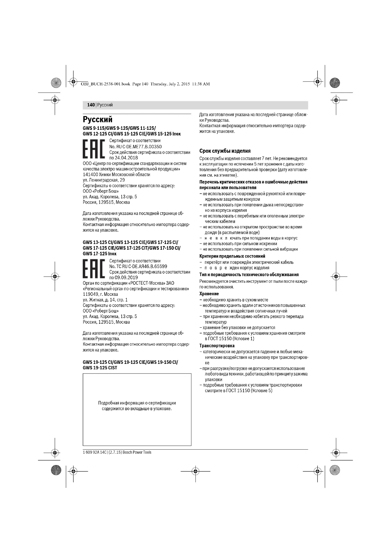 GWS 12-125 CI/GWS 15-125 CIE/GWS 15-125 Inox Сертификат о соответствии No. RU C-DE.ME77.B.00350 Срок действия сертификата о соответствии по 24.04.2018 ООО «Центр по сертификации стандартизации и систем качества электро-машиностроительной продукции» 141400 Химки Московской области ул. Ленинградская, 29 Сертификаты о соответствии хранятся по адресу: ООО «Роберт Бош» ул. Акад. Королева, 13 стр. 5 Россия, 129515, Москва Дата изготовления указана на последней странице об- ложки Руководства. Контактная информация относительно импортера содер- жится на упаковке. GWS 13-125 CI/GWS 13-125 CIE/GWS 17-125 CI/ GWS 17-125 CIE/GWS 17-125 CIT/GWS 17-150 CI/ GWS 17-125 Inox Сертификат о соответствии No. TC RU С-DE.АЯ46.В.65599 Срок действия сертификата о соответствии по 09.09.2019 Орган по сертификации «РОСТЕСТ-Москва» ЗАО «Региональный орган по сертификации и тестированию» 119049, г. Москва ул. Житная, д. 14, стр. 1 Сертификаты о соответствии хранятся по адресу: ООО «Роберт Бош» ул. Акад. Королева, 13 стр. 5 Россия, 129515, Москва Дата изготовления указана на последней странице об- ложки Руководства. Контактная информация относительно импортера содер- жится на упаковке. GWS 19-125 CI/GWS 19-125 CIE/GWS 19-150 CI/