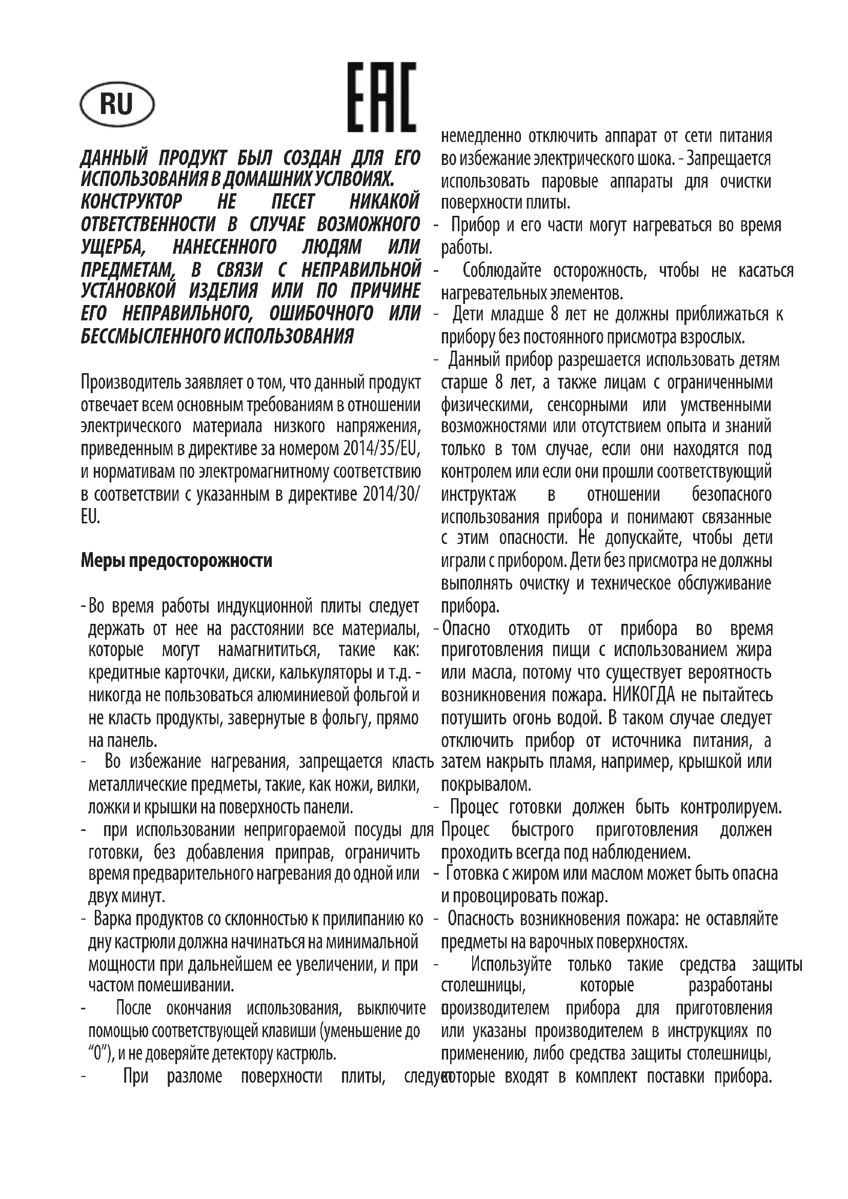 Во время работы индукционной плиты следует держать от нее на расстоянии все материалы, которые могут намагнититься, такие как: кредитные карточки, диски, калькуляторы и т.д. - никогда не пользоваться алюминиевой фольгой и не класть продукты, завернутые в фольгу, прямо