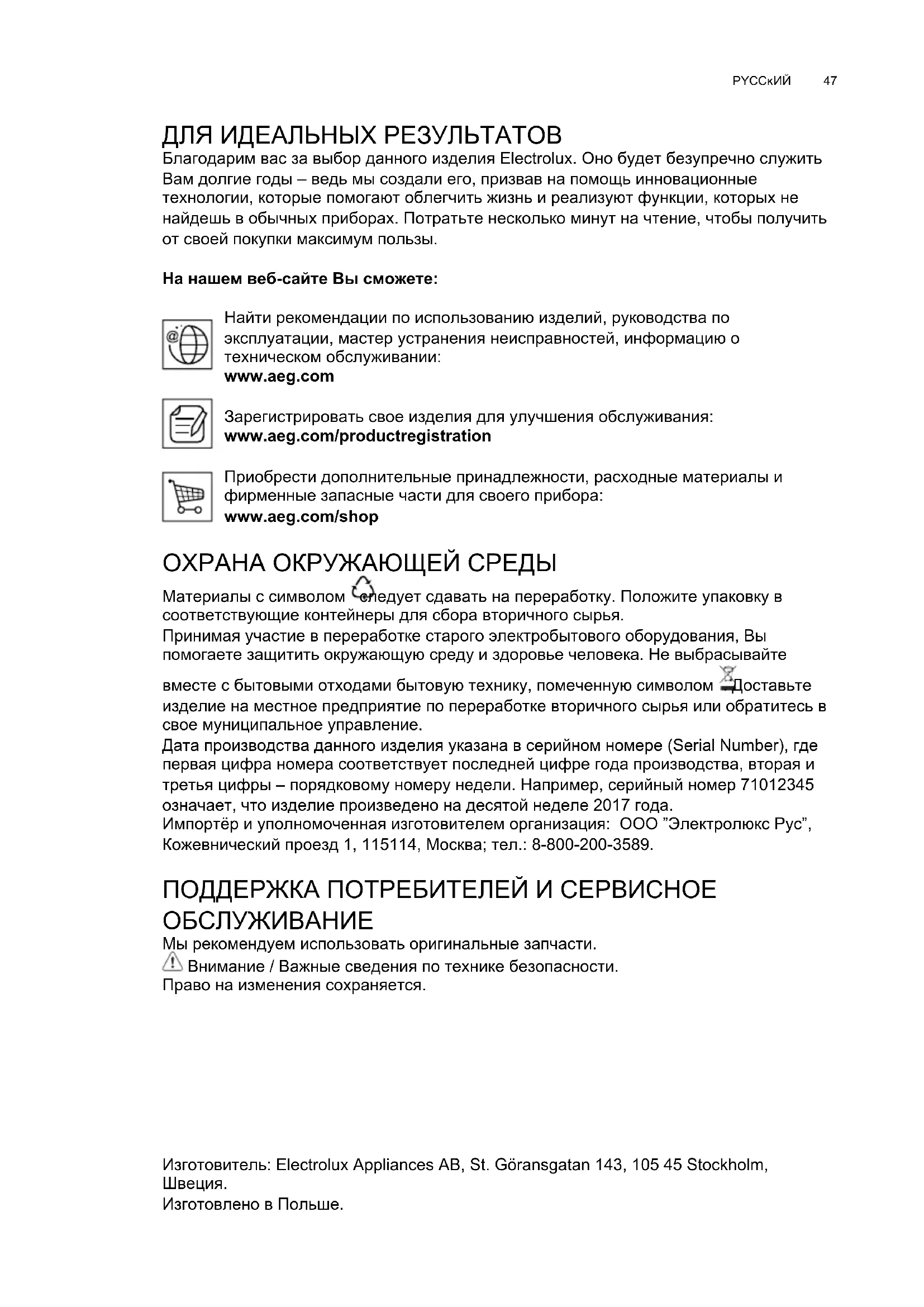 Afbryd apparatet fra el-nettet. Pas på! Sørg for at pærerne er kolde før de berøres. Benyt kun halogenpærer på 12V -20W max - G4, og sørg for ikke at røre ved dem med hænderne. X08155BV-X Emhætten er udstyret med et belysningssystem baseret på lysdiode- teknologi. Lysdioderne sikrer optimal belysning, holdbarhed op til 10 gange længere end almindelige pærer, og de giver mulighed for at spare 90% elektricitet. Pas på: Se aldrig direkte på lyset fra lysdioderne. Til udskiftning af lamperne, ret henvendelse til det godkendte reservedelscenter47 PYCCĸИЙ ДЛЯ ИДЕАЛЬНЫХ РЕЗУЛЬТАТОВ Благодарим вас за выбор данного изделия Electrolux. Оно будет безупречно служить Вам долгие годы – ведь мы создали его, призвав на помощь инновационные технологии, которые помогают облегчить жизнь и реализуют функции, которых не найдешь в обычных приборах. Потратьте несколько минут на чтение, чтобы получить от своей покупки максимум пользы. На нашем веб-сайте Вы сможете: Найти рекомендации по использованию изделий, руководства по эксплуатации, мастер устранения неисправностей, информацию о техническом обслуживании: www.aeg.com Зарегистрировать свое изделия для улучшения обслуживания: www.aeg.com/productregistration Приобрести дополнительные принадлежности, расходные материалы и фирменные запасные части для своего прибора: www.aeg.com/shop ОХРАНА ОКРУЖАЮЩЕЙ СРЕДЫ Материалы с символом следует сдавать на переработку. Положите упаковку в соответствующие контейнеры для сбора вторичного сырья. Принимая участие в переработке старого электробытового оборудования, Вы помогаете защитить окружающую среду и здоровье человека. Не выбрасывайте вместе с бытовыми отходами бытовую технику, помеченную символом . Доставьте изделие на местное предприятие по переработке вторичного сырья или обратитесь в свое муниципальное управление. Дата производства данного изделия указана в серийном номере (Serial Numbеr), где первая цифра номера соответствует последней цифре года производства, вторая и третья цифры – порядковому номеру недели. Например, серийный номер 71012345 означает, что изделие произведено на десятой неделе 2017 года. Импортёр и уполномоченная изготовителем организация: ООО ”Электролюкс Рус”, Кожевнический проезд 1, 115114, Москва; тел.: 8-800-200-3589. ПОДДЕРЖКА ПОТРЕБИТЕЛЕЙ И СЕРВИСНОЕ ОБСЛУЖИВАНИЕ Мы рекомендуем использовать оригинальные запчасти. Внимание / Важные сведения по технике безопасности. Право на изменения сохраняется. Изготовитель: Electrolux Appliances AB, St. Göransgatan 143, 105 45 Stockholm,