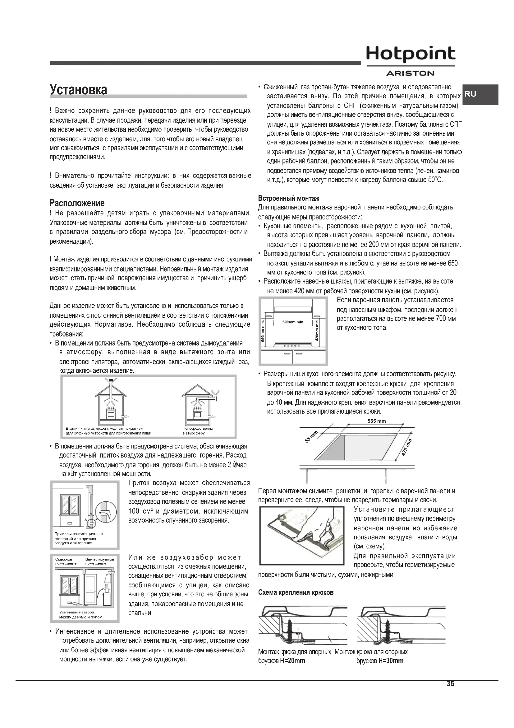 - Izgaraların yerleri değişmiş.Установка ! Важно сохранить данное руководство для его последующих консультации. В случае продажи, передачи изделия или при переезде на новое место жительства необходимо проверить, чтобы руководство оставалось вместе с изделием, для того чтобы его новый владелец мог ознакомиться с правилами эксплуатации и с соответствующими предупреждениями. ! Внимательно прочитайте инструкции: в них содержатся важные сведения об установке, эксплуатации и безопасности изделия. Расположение ! Не разрешайте детям играть с упаковочными материалами. Упаковочные материалы должны быть уничтожены в соответствии с правилами раздельного сбора мусора (см. Предосторожности и рекомендации). ! Монтаж изделия производится в соответствии с данными инструкциями квалифицированными специалистами. Неправильный монтаж изделия может стать причиной повреждения имущества и причинить ущерб людям и домашним животным. Данное изделие может быть установлено и использоваться только в помещениях с постоянной вентиляциеи в соответствии с положениями действующих Нормативов. Необходимо соблюдать следующие требования: