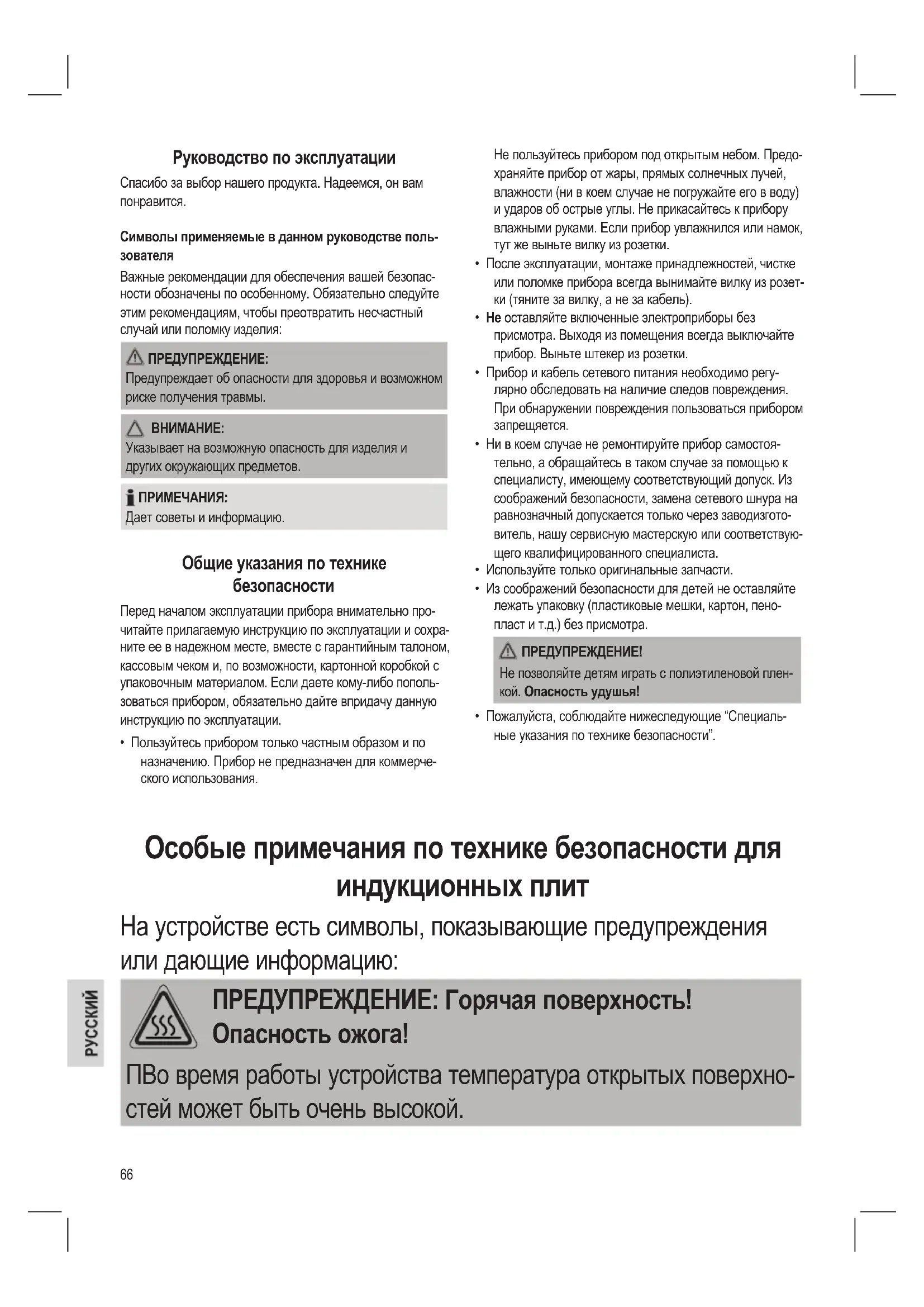 - Пожалуйста, соблюдайте нижеследующие “Специаль- ные указания по технике безопасности”. Особые примечания по технике безопасности для индукционных плит На устройстве есть символы, показывающие предупреждения или дающие информацию: ПРЕДУПРЕЖДЕНИЕ: Горячая поверхность! Опасность ожога! ПВо время работы устройства температура открытых поверхно- стей может быть очень высокой.67 ПРЕДУПРЕЖДЕНИЕ: