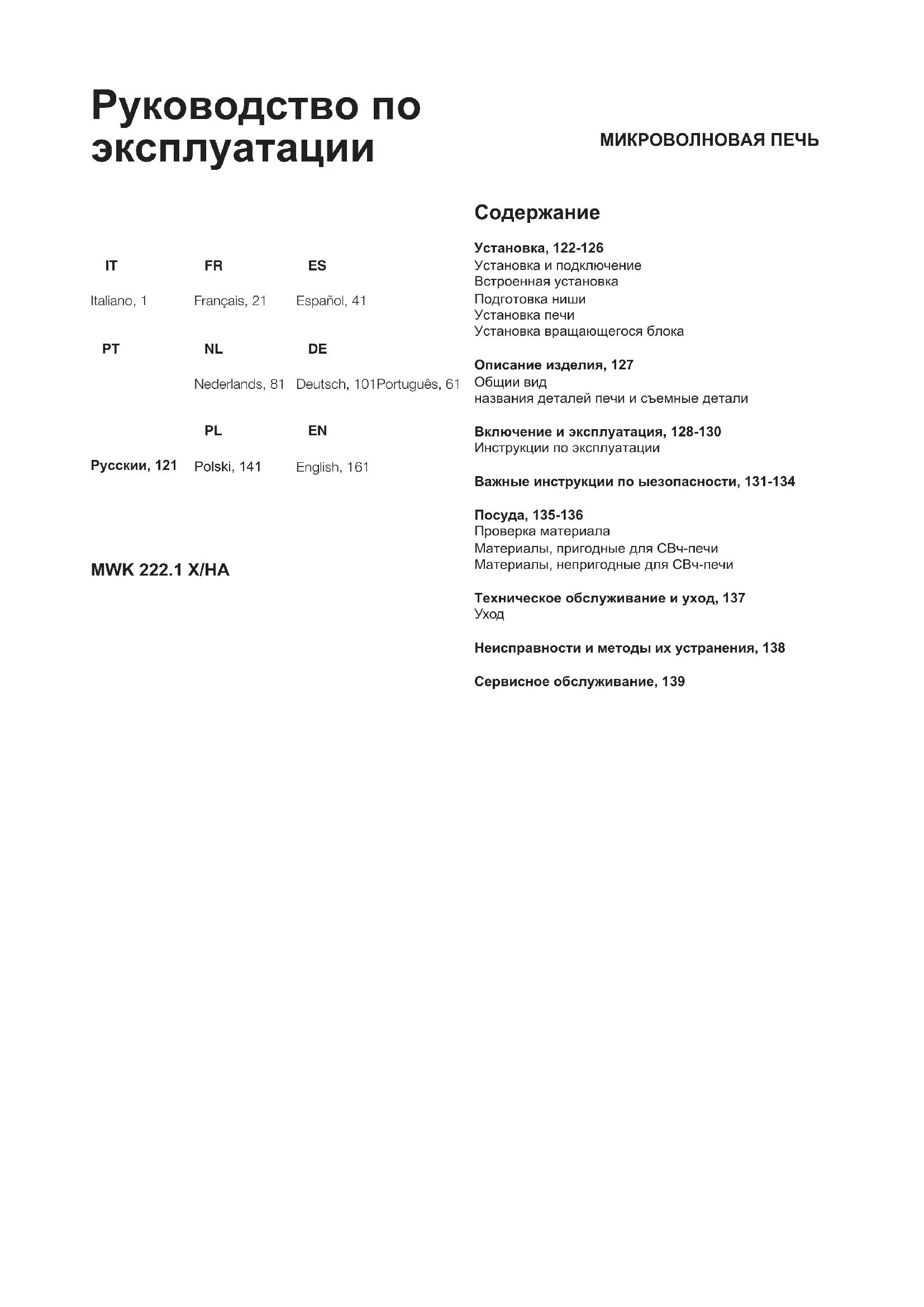 названия деталей печи и съемные детали Включение и эксплуатация, 128-130 Инструкции по эксплуатации Важные инструкции по ыезопасности, 131-134 Посуда, 135-136 Проверка материала Материалы, пригодные для СВч-печи Материалы, непригодные для СВч-печи Техническое обслуживание и уход, 137