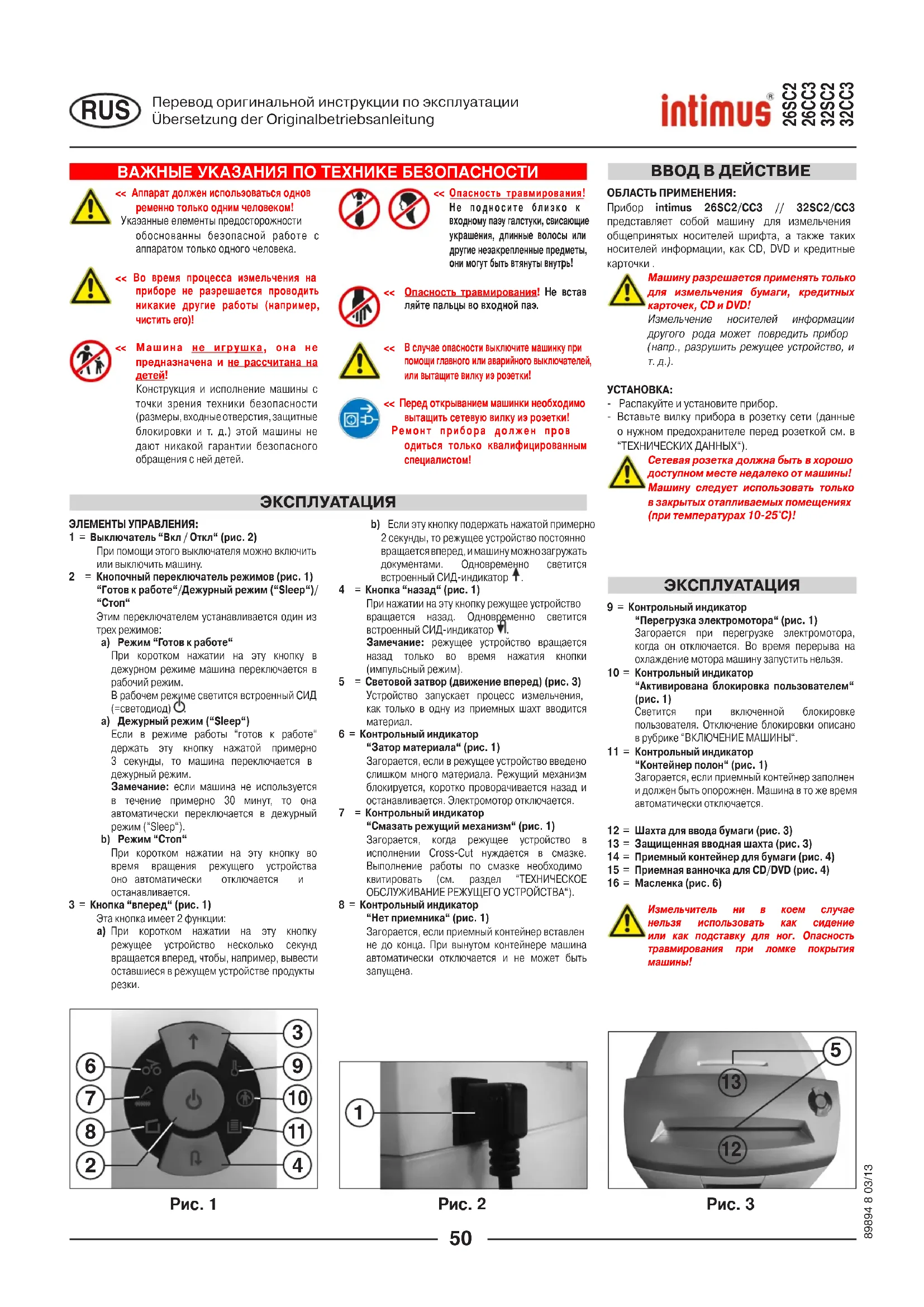 RUS ЭКСПЛУАТАЦИЯ Påc. 1 Påc. 4 ПереводоригинальнойинструкциипоэксплуатацииÜbersetzungderOriginalbetriebsanleitung- Оставшийсяматериалдля измельченияавтоматическипротягиваетсякрежущемумеханизмуиразрезается.- Контрольныйиндикатор (6)гаснет. СИД-индикаторкнопкипродвижениявперед(3)горитпостоянно.- По окончании резки продолжить ввод носителейинформации,непревышаяразрешеннуюдозировку.- Если потребуется, вручную запускать вращениережущегоустройствапоочередновперединазаддотехпор,покавесьматериалнебудетвтянутиМ.Перед каждым переключением направления движения нужно подождать до остановки мотора!ЗАЩИТА ЭЛЕКТРОМОТОРА:При перегрузке электромотор отключается. Мигаетконтрольный индикатор (9). Выключите главныйвыключательприбора(1).После охлаждения в течение около 25-40 минут (взависимостиотмоделиитемпературыокружения)приборможносновавключить.ЗАТОР МАТЕРИАЛА В ПРИБОРЕ:(Функция автореверса)Есливрезультатевводабольшогоколичестваматериала вмашинеобразуетсязатор,тоонареагируетследующим образом:- Режущий механизм блокируется, затем коротко вращается назад (материал освобождается) и останавливается.Электромоторотключается.- Загораетсяконтрольныйиндикатор (6).Поступайтеследующимобразом:Затор материала в шахте для ввода бумаги (12)- Выньте продвинутую назад бумагу из приемной шахты(12). - Режущий механизм вращается вперед и измельчает оставшуюсявнембумагу.- Контрольныйиндикатор (6)гаснет.СИД-индикаторкнопкидвижениявперед(3)горитпостоянно. - Продолжить измельчение, не вводя слишком много бумаги.Затор материала в защищенной приемной шахте (13)- Выньтепродвинутыйназадматериал.Вынимайте материал осторожно, чтобы не порезаться об острые края среза!ПРОВЕРКИ ПРИ НАРУШЕНИИ РАБОТЫ:Еслиприборнеработает,проверьтеследующиепункты:- включеналисетевая вилкавсеть?- не находится ли прибор в дежурном режиме (“Sleep“)? см. рубрику “АВТОМАТИКА ЭКОНОМИИ ЭЛЕКТРОЭНЕРГИИ“.- активированиилиблокировка пользователем? см. рубрику “УСТАНОВКА БЛОКИРОВКИ ПОТРЕБИТЕЛЕМ“.- вставленлиприемный контейнер?- неполонлиприемный контейнер? действуйте по инструкции “ОПОРОЖНЕНИЕ ПРИЕМНОГОКОНТЕЙНЕРА“.- нетлизатора материалавприборе? действуйте по инструкции “ЗАТОР МАТЕРИАЛА В ПРИБОРЕ“.- неперегруженлиэлектромотор? см.рубрику“ЗАЩИТАЭЛЕКТРОМОТОРА“.Если все пункты проверки в порядке, а прибор не работает, обратитесь к продавшей Ваш прибор