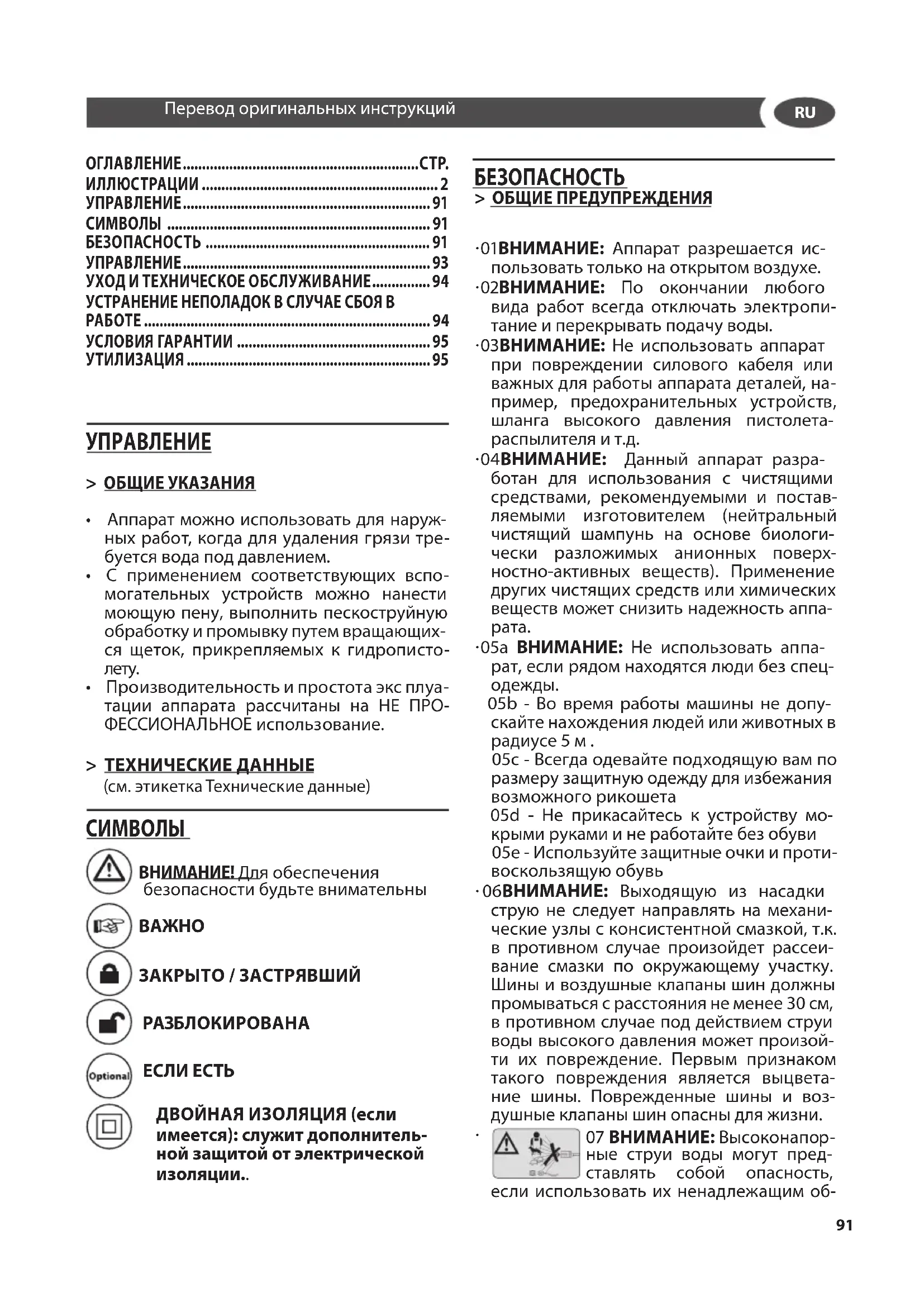 - 03ВНИМАНИЕ: Не использовать аппарат при повреждении силового кабеля или важных для работы аппарата деталей, на- пример, предохранительных устройств, шланга высокого давления пистолета- распылителя и т.д.