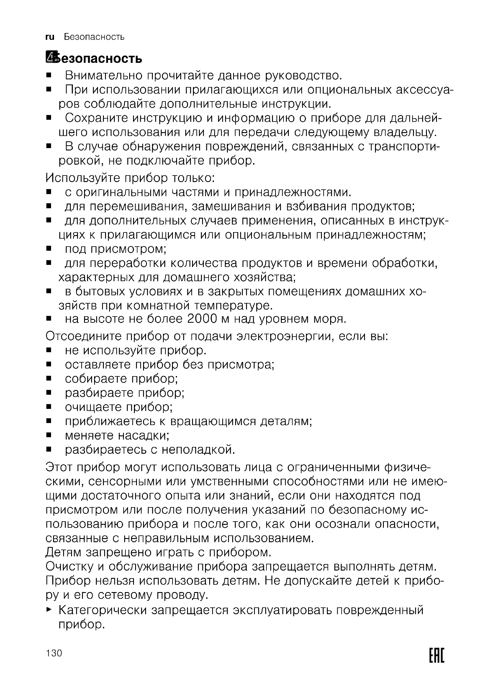 Інформацію згідно з регламентом (EU) 2023/826 можна знайти в мережі Інтернет за адресою www.bosch- home.com на сторінці виробу й сервісній сторінці вашого приладу в ін- струкціях з експлуатації і в додаткових документах. 129ru Безопасность Безопасность Безопасность ¡ Внимательно прочитайте данное руководство. ¡ При использовании прилагающихся или опциональных аксессуа- ров соблюдайте дополнительные инструкции. ¡ Сохраните инструкцию и информацию о приборе для дальней- шего использования или для передачи следующему владельцу. ¡ В случае обнаружения повреждений, связанных с транспорти- ровкой, не подключайте прибор. Используйте прибор только: ¡ с оригинальными частями и принадлежностями. ¡ для перемешивания, замешивания и взбивания продуктов; ¡ для дополнительных случаев применения, описанных в инструк- циях к прилагающимся или опциональным принадлежностям; ¡ под присмотром; ¡ для переработки количества продуктов и времени обработки, характерных для домашнего хозяйства; ¡ в бытовых условиях и в закрытых помещениях домашних хо- зяйств при комнатной температуре. ¡ на высоте не более 2000м над уровнем моря. Отсоедините прибор от подачи электроэнергии, если вы: ¡ не используйте прибор. ¡ оставляете прибор без присмотра; ¡ собираете прибор; ¡ разбираете прибор; ¡ очищаете прибор; ¡ приближаетесь к вращающимся деталям; ¡ меняете насадки; ¡ разбираетесь с неполадкой. Этот прибор могут использовать лица с ограниченными физиче- скими, сенсорными или умственными способностями или не имею- щими достаточного опыта или знаний, если они находятся под присмотром или после получения указаний по безопасному ис- пользованию прибора и после того, как они осознали опасности, связанные с неправильным использованием. Детям запрещено играть с прибором. Очистку и обслуживание прибора запрещается выполнять детям. Прибор нельзя использовать детям. Не допускайте детей к прибо- ру и его сетевому проводу. Категорически запрещается эксплуатировать поврежденный