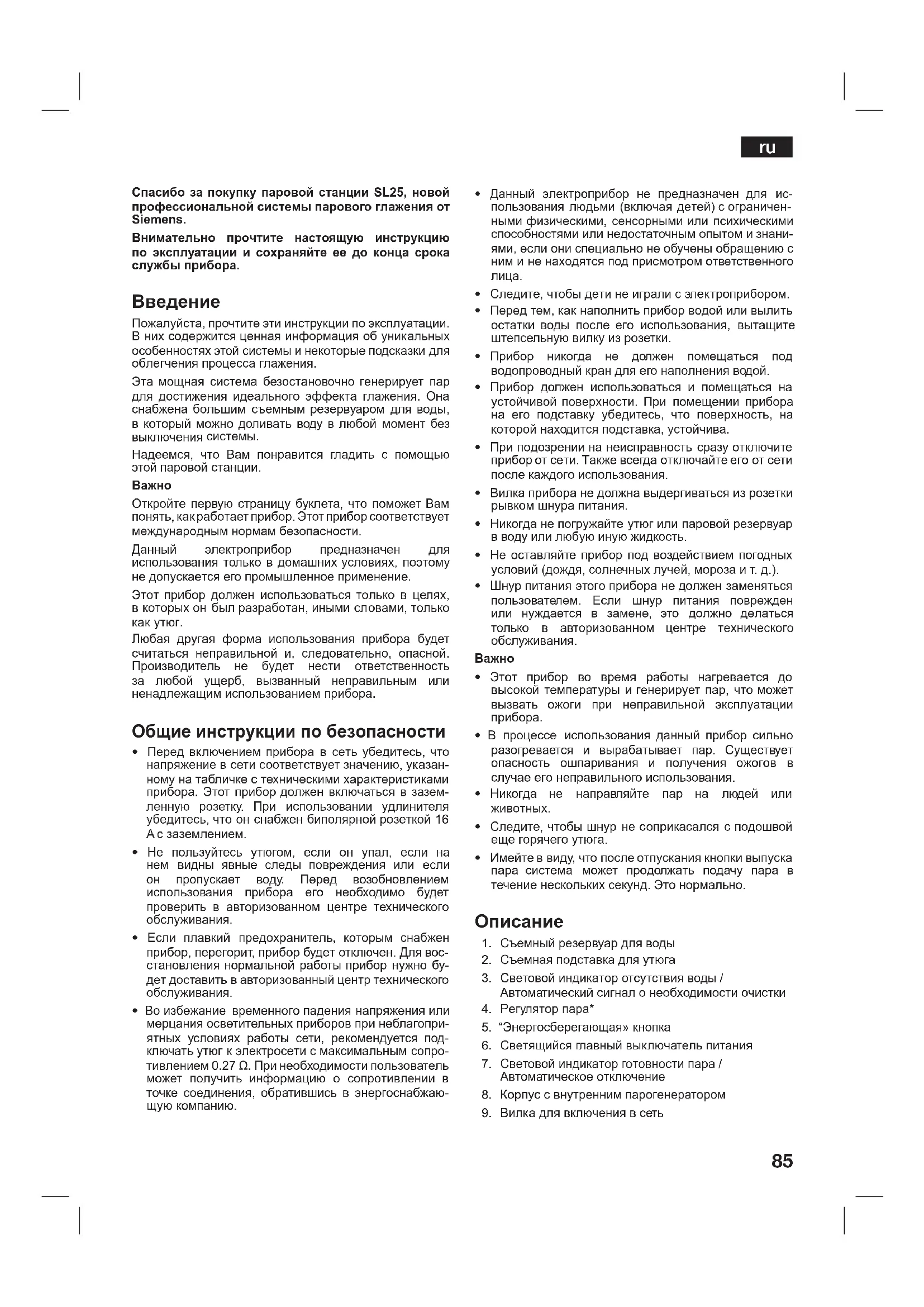 Спасибо за покупку паровой станции SL25, новой профессиональной системы парового глажения от Siemens. Внимательно прочтите настоящую инструкцию по эксплуатации и сохраняйте ее до конца срока службы прибора.