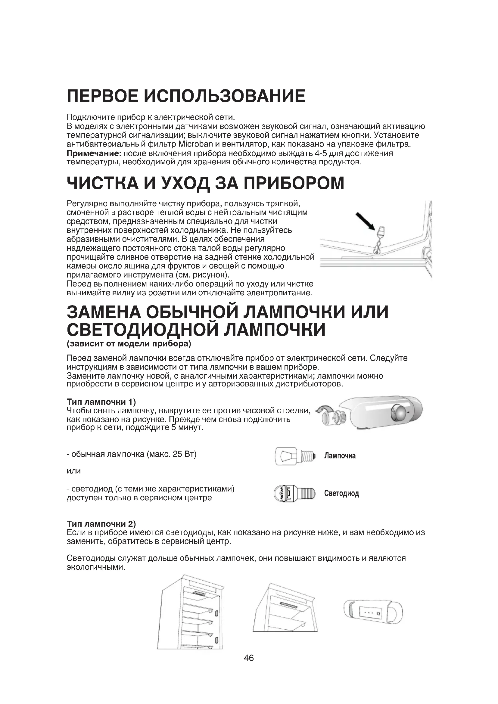 Регулярно выполняйте чистку прибора, пользуясь тряпкой, смоченной в растворе теплой воды с нейтральным чистящим средством, предназначенным специально для чистки внутренних поверхностей холодильника. Не пользуйтесь абразивными очистителями. В целях обеспечения надлежащего постоянного стока талой воды регулярно прочищайте сливное отверстие на задней стенке холодильной камеры около ящика для фруктов и овощей с помощью прилагаемого инструмента (см. рисунок). Перед выполнением каких-либо операций по уходу или чистке вынимайте вилку из розетки или отключайте электропитание. Подключите прибор к электрической сети. В моделях с электронными датчиками возможен звуковой сигнал, означающий активацию температурной сигнализации; выключите звуковой сигнал нажатием кнопки. Установите антибактериальный фильтр Microban и вентилятор, как показано на упаковке фильтра. Примечание: после включения прибора необходимо выждать 4-5 для достижения температуры, необходимой для хранения обычного количества продуктов. ПЕРВОЕ ИСПОЛЬЗОВАНИЕ ЧИСТКА И УХОД ЗА ПРИБОРОМ ЗАМЕНА ОБЫЧНОЙ ЛАМПОЧКИ ИЛИ СВЕТОДИОДНОЙ ЛАМПОЧКИ (зависит от модели прибора) LED- strip Dragon et247 Отключите прибор от электропитания, опорожните, разморозьте (при необходимости) и очистите. Оставьте дверцу слегка приоткрытой, чтобы обеспечить циркуляцию воздуха в отделениях. Это позволит вам избежать развития плесени и неприятных запахов. ЕСЛИ ПРИБОР НЕ ИСПОЛЬЗУЕТСЯ Держите дверцу закрытой: это позволит сохранять продукты в охлажденном состоянии так долго, как только это возможно. Не замораживайте снова частично размороженные продукты. При длительном отключении электроэнергии возможно включение звукового сигнала (в приборах, оборудованных электронными датчиками). В СЛУЧАЕ ПРЕРЫВАНИЯ ПОДАЧИ ЭЛЕКТРОЭНЕРГИИ Холодильная камера предназначена для хранения свежих продуктов и напитков. Размораживание холодильной камеры происходит полностью автоматически. Появление капель воды на задней стенке холодильной камеры указывает на процесс автоматического размораживания. Талая вода стекает через сливное отверстие в специальную емкость и затем испаряется. В зависимости от модели холодильник может быть оборудован специальным отделением с нулевой температурой Activ0°, которое идеально подходит для хранения свежего мяса и