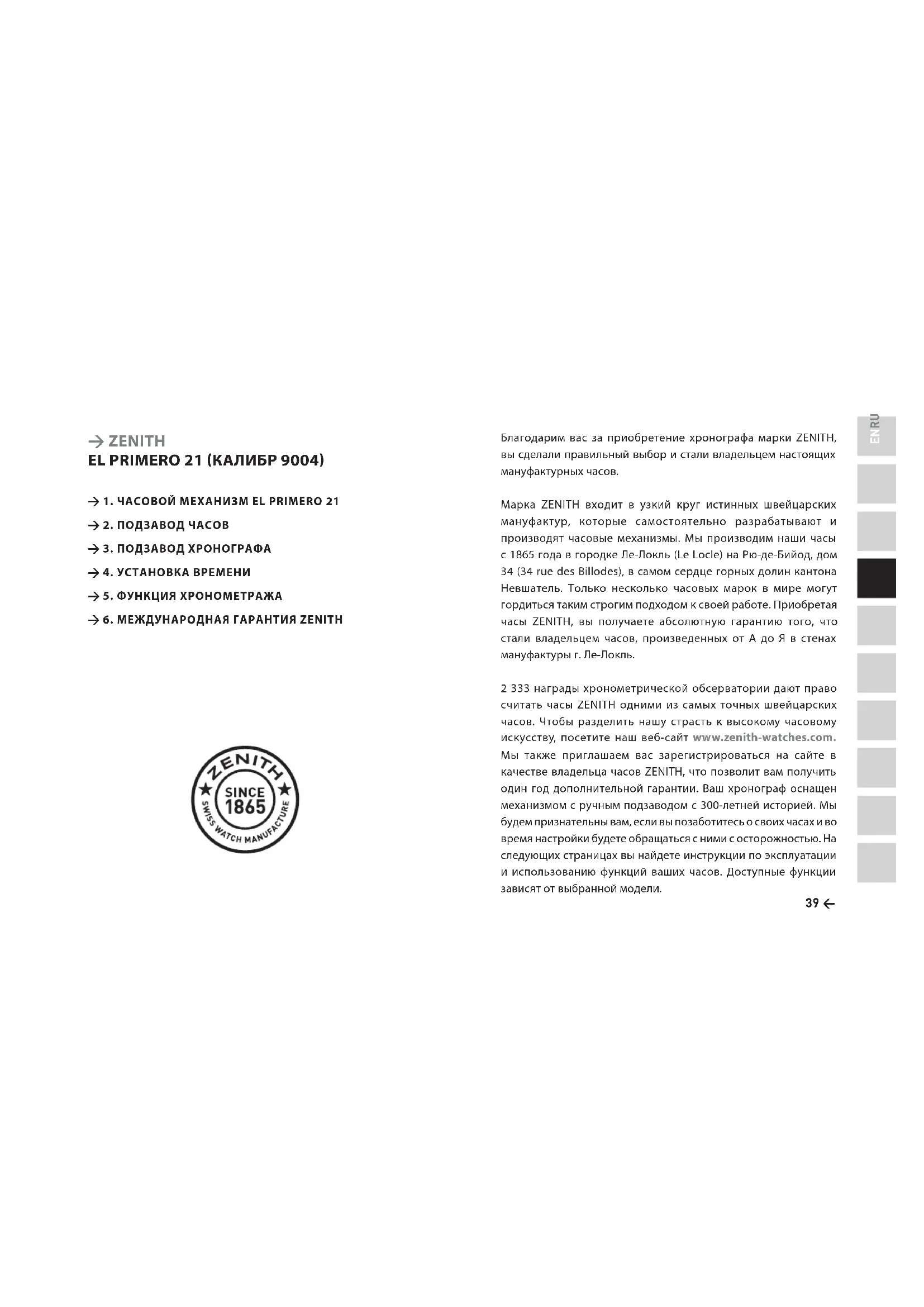 > 1. ЧАСОВОЙ МЕХАНИЗМ EL PRIMERO 21 > 2. ПОДЗАВОД ЧАСОВ > 3. ПОДЗАВОД ХРОНОГРАФА > 4. УСТАНОВКА ВРЕМЕНИ > 5. ФУНКЦИЯ ХРОНОМЕТРАЖА > 6. МЕЖДУНАРОДНАЯ ГАРАНТИЯ ZENITH > ZENITH EL PRIMERO 21 (КАЛИБР 9004) Благодарим вас за приобретение хронографа марки ZENITH, вы сделали правильный выбор и стали владельцем настоящих мануфактурных часов. Марка ZENITH входит в узкий круг истинных швейцарских мануфактур, которые самостоятельно разрабатывают и производят часовые механизмы. Мы производим наши часы с 1865 года в городке Ле-Локль (Le Locle) на Рю-де-Бийод, дом 34 (34 rue des Billodes), в самом сердце горных долин кантона Невшатель. Только несколько часовых марок в мире могут гордиться таким строгим подходом к своей работе. Приобретая часы ZENITH, вы получаете абсолютную гарантию того, что стали владельцем часов, произведенных от A до Я в стенах мануфактуры г. Ле-Локль. 2 333 награды хронометрической обсерватории дают право считать часы ZENITH одними из самых точных швейцарских часов. Чтобы разделить нашу страсть к высокому часовому искусству, посетите наш веб-сайт www.zenith-watches.com. Мы также приглашаем вас зарегистрироваться на сайте в качестве владельца часов ZENITH, что позволит вам получить один год дополнительной гарантии. Ваш хронограф оснащен механизмом с ручным подзаводом с 300-летней историей. Мы будем признательны вам, если вы позаботитесь о своих часах и во время настройки будете обращаться с ними с осторожностью. На следующих страницах вы найдете инструкции по эксплуатации и использованию функций ваших часов. Доступные функции зависят от выбранной модели.41 <